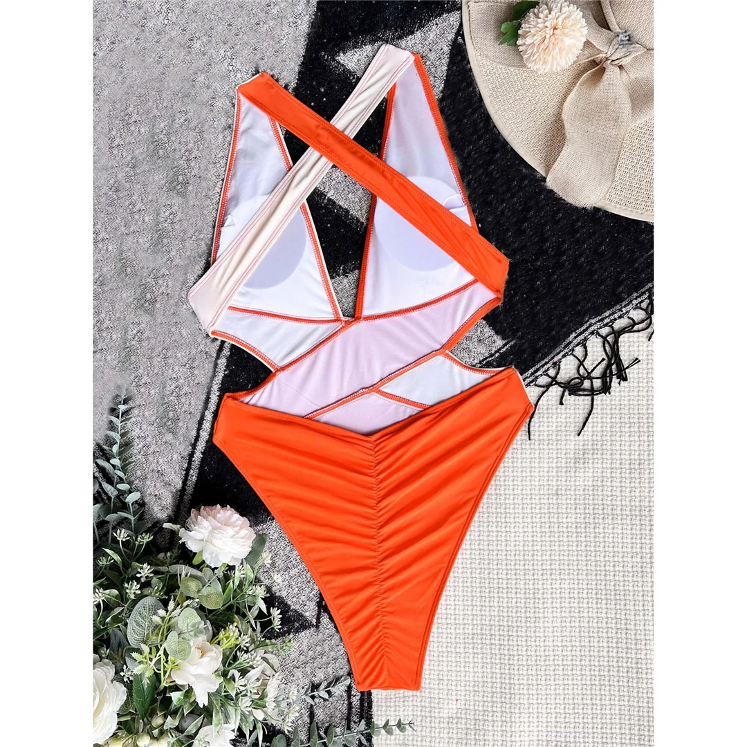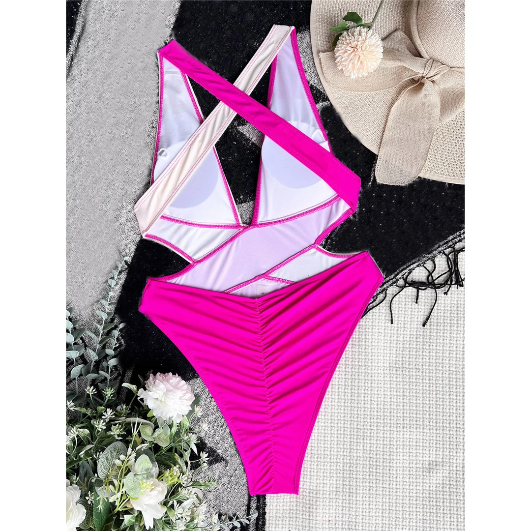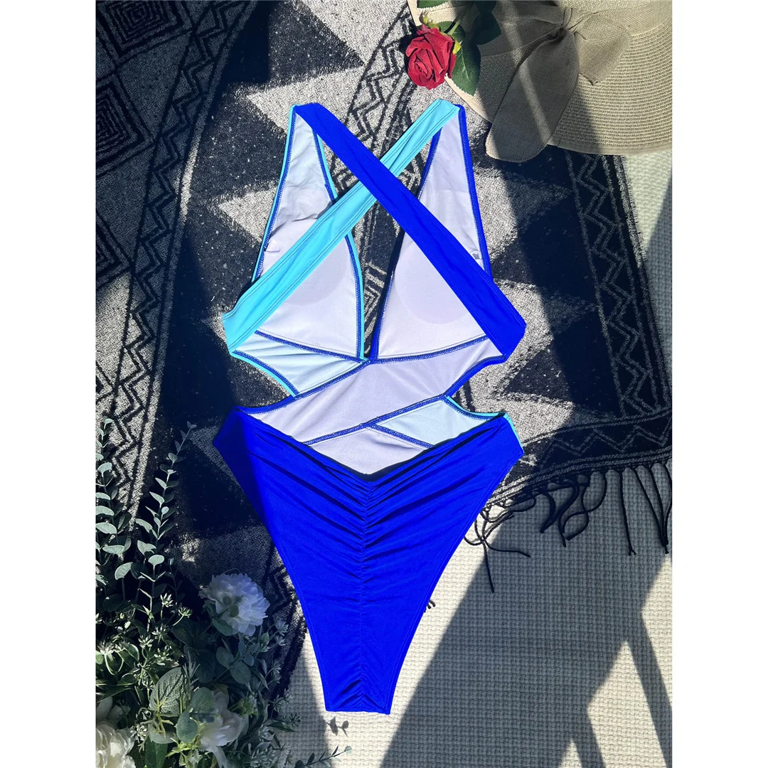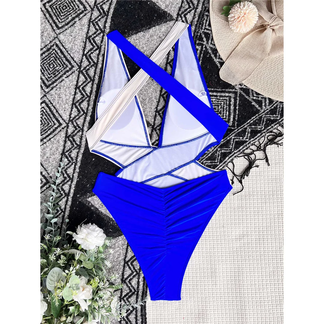 Splicing Deep V Neck Cross Back One Piece Swimsuit Women Swimwear Female Monokini Scrunch Butt Bather Bathing Suit Swim V3787