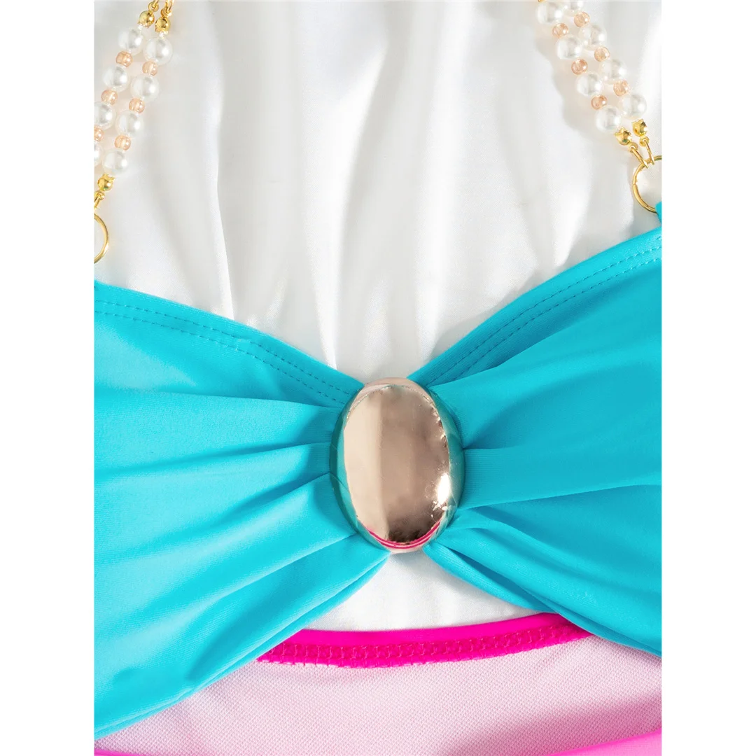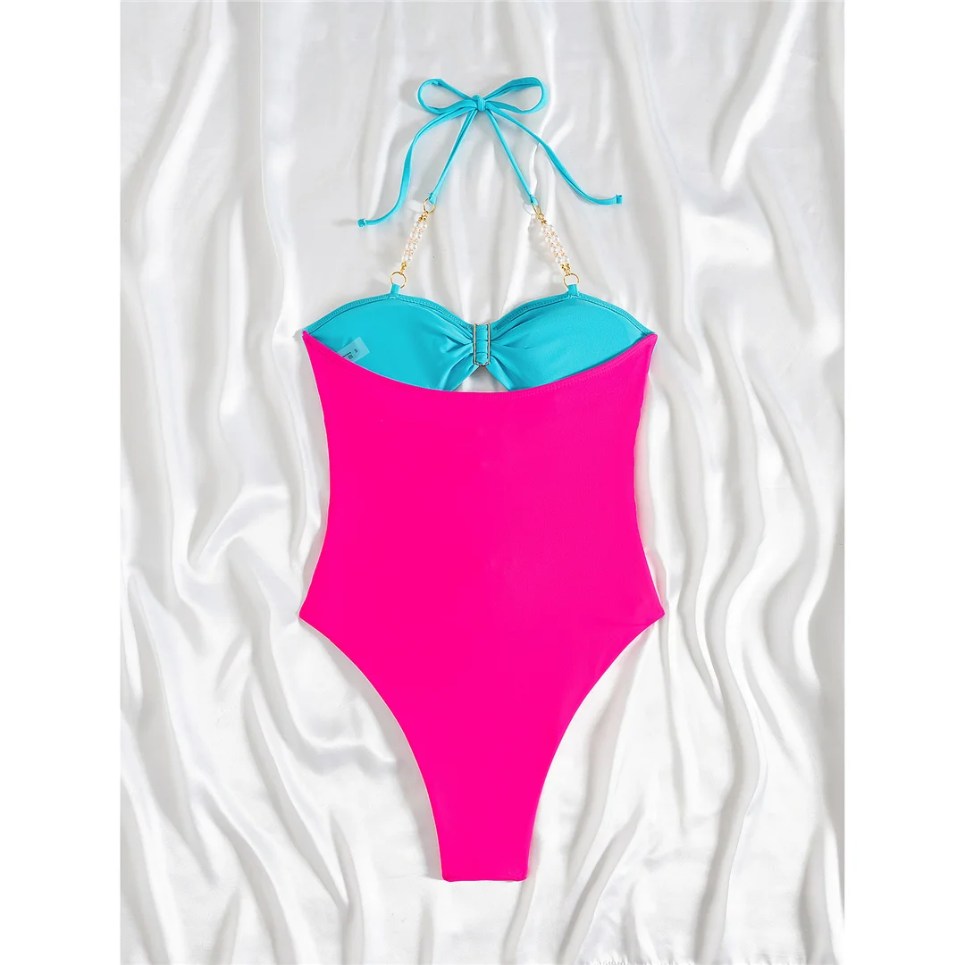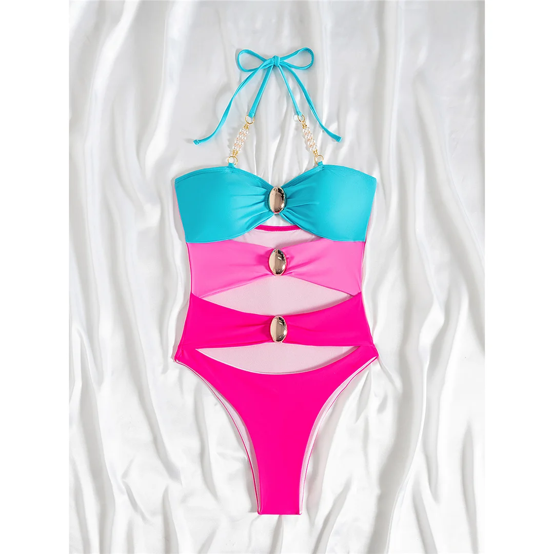 Splicing Halter Cut Out Metal Rings Women Swimwear One Piece Swimsuit Female High Leg Cut Padded Bather Bathing Suit Swim V6263