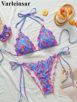 XS – L Flowers Printed Halter Bikini Female Swimsuit Women Swimwear Two-pieces Bikini set Padded Bather Bathing Suit Swim V6914