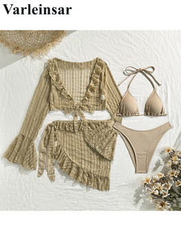 New With Sarong Halter Ruffled Bikini Women Swimwear Female Swimsuit Three-pieces Bikini set Bather Bathing Suit Swim Lady V4144