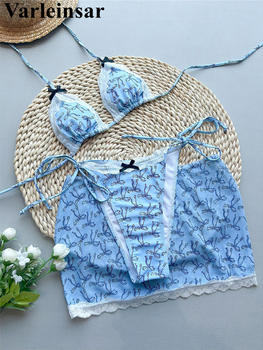 Printed With Skirt Halter Bikini Women Swimwear Female Swimsuit Three-pieces Bikini set Padded Bather Bathing Suit Swim V7118