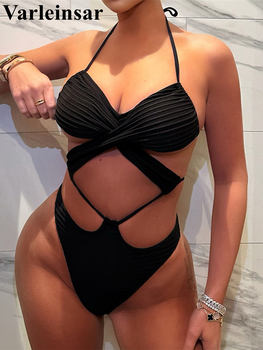 V Neck Halter Wrinkled Women Swimwear One Piece Swimsuit Female High Leg Cut Backless Monokini Bather Bathing Suit Swim V5878