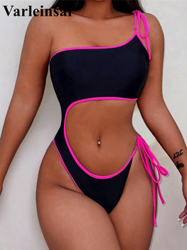S – XXL Splicing Cut Out Monokini One Piece Swimsuit Women Swimwear Female High Leg Cut Padded Bather Bathing Suit Swim V7508