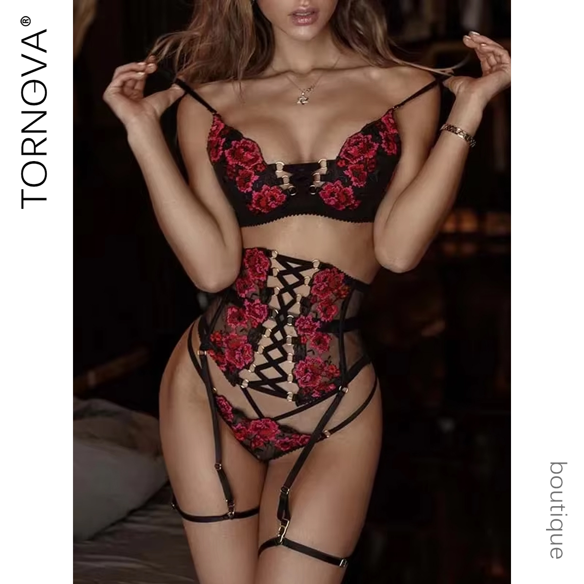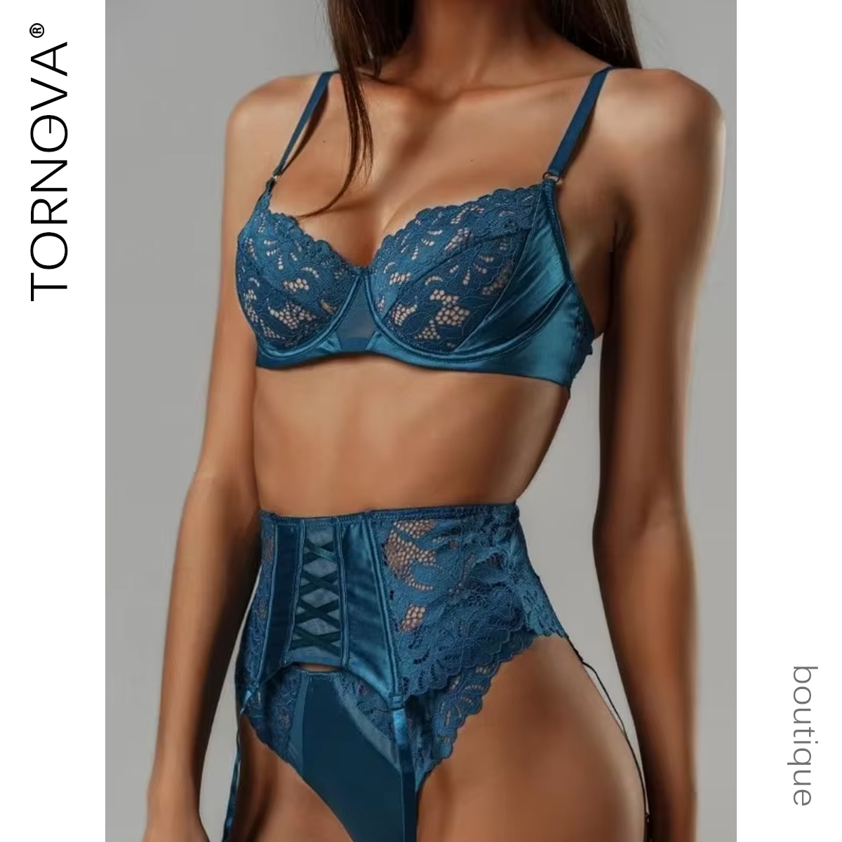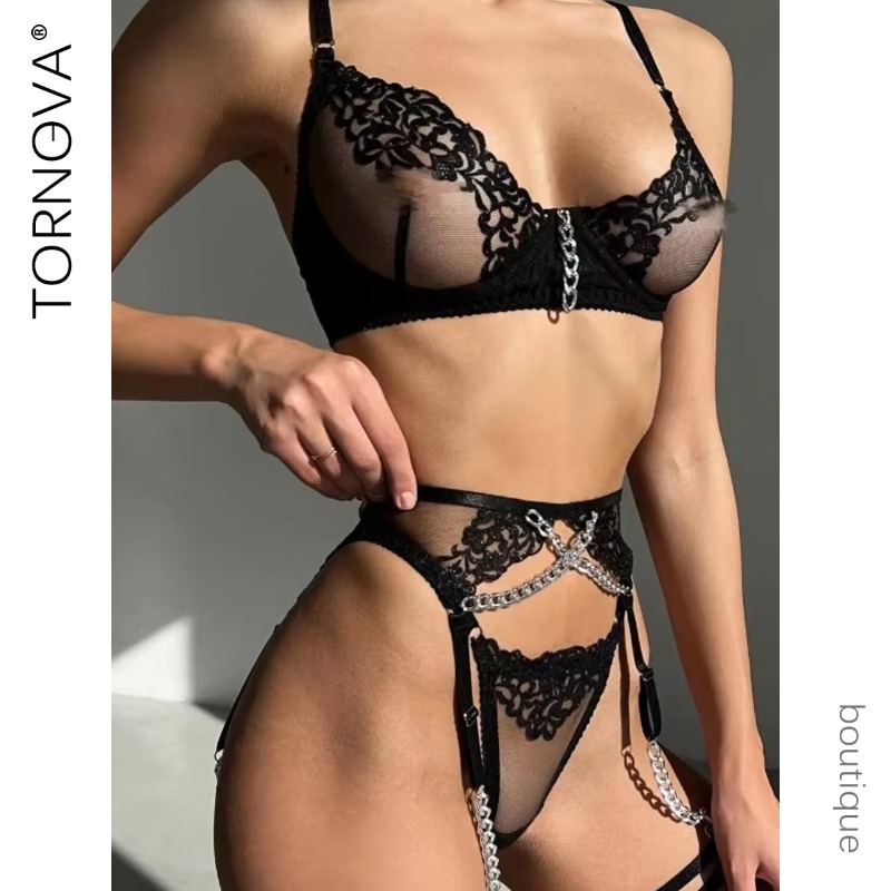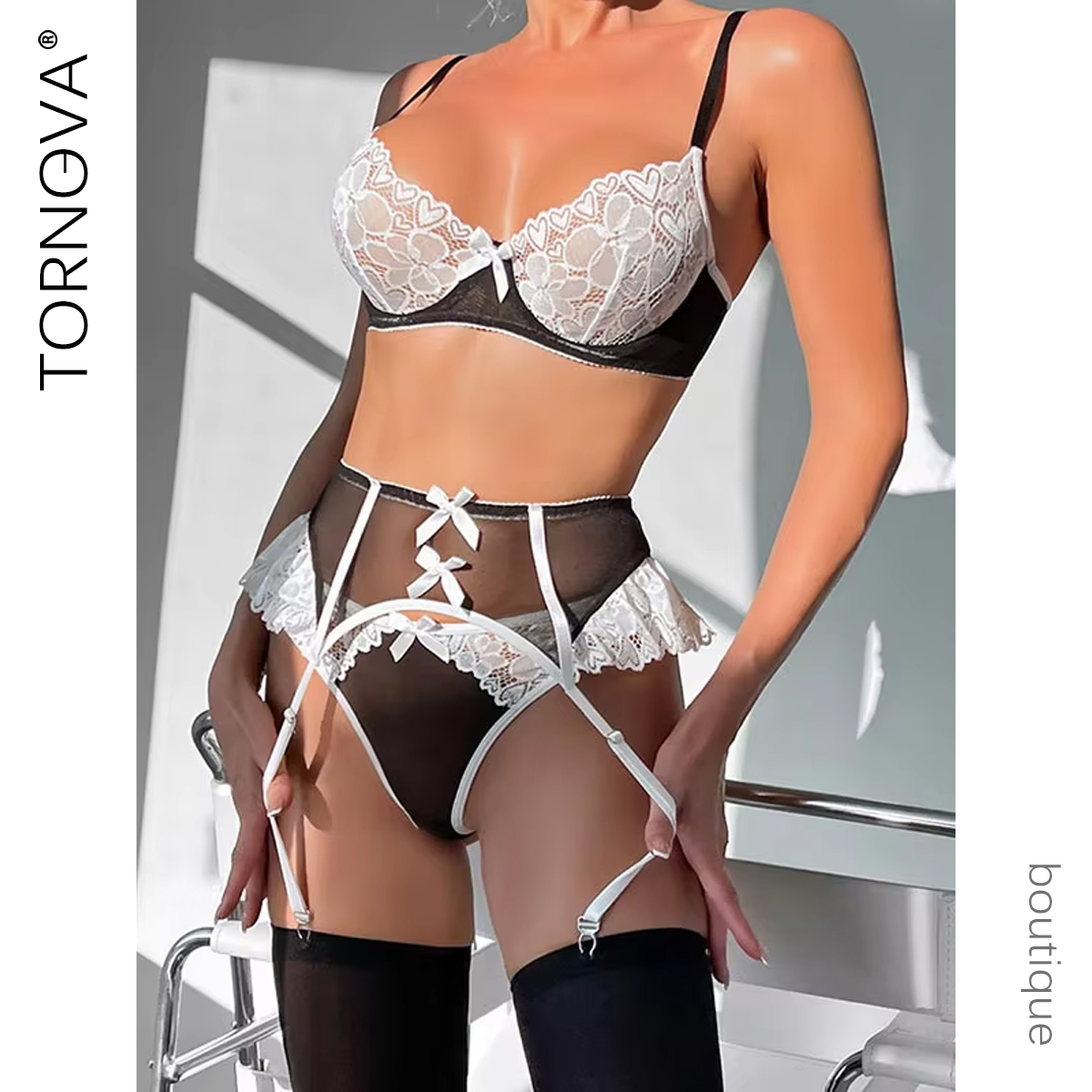 Tornova 4 Piece Sexy Lingerie Set for Women Mesh and Lace Sexy Perspective Push-up Solid Color Lace Hollow Out Underwear Set New