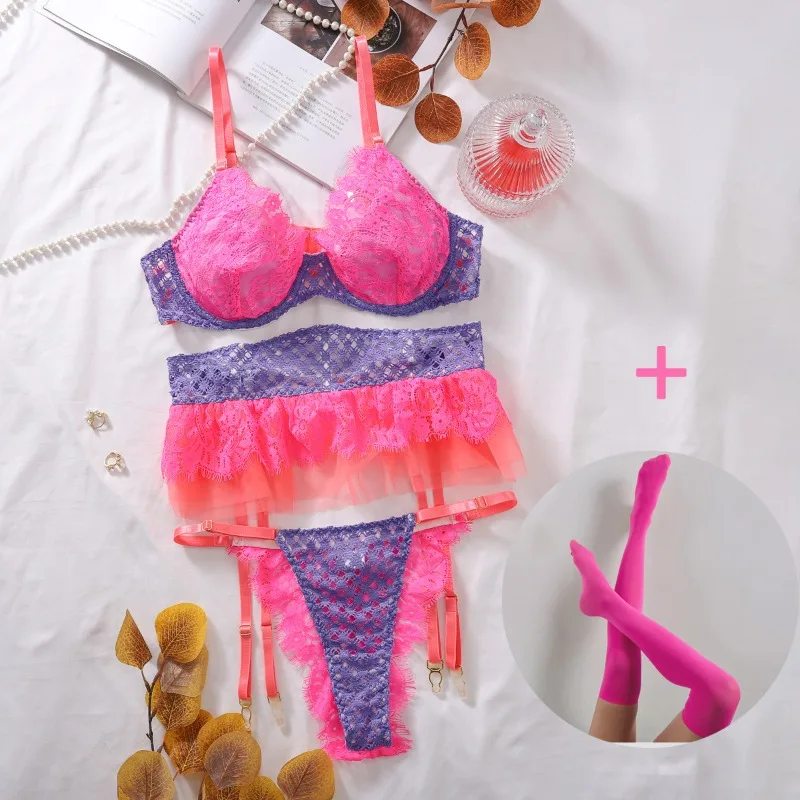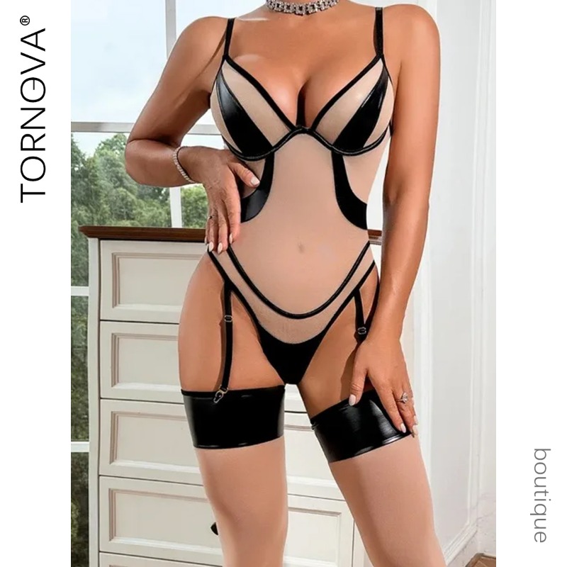 Tornova Sexy Lace Lingerie Set for Women Mesh Patchwork Women’s Underwear Suit Contrast Color Stockings Cross Garter 5 Piece Set