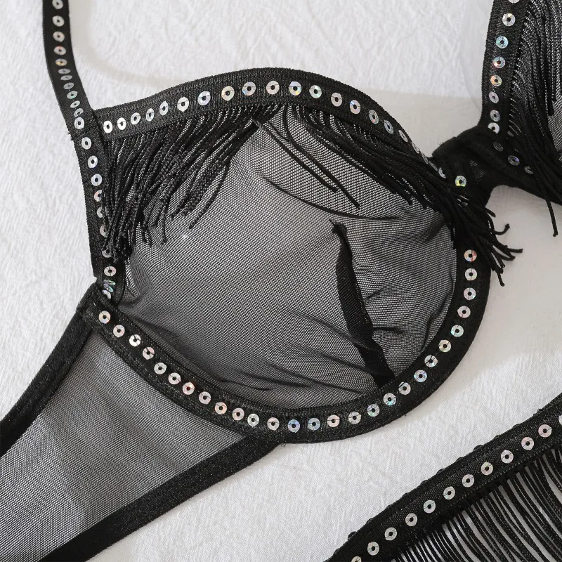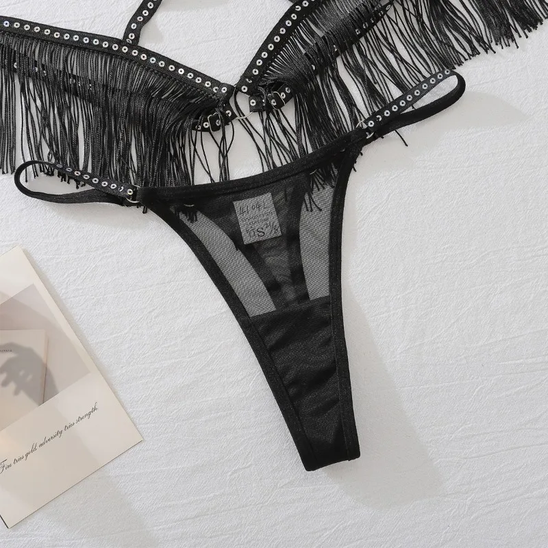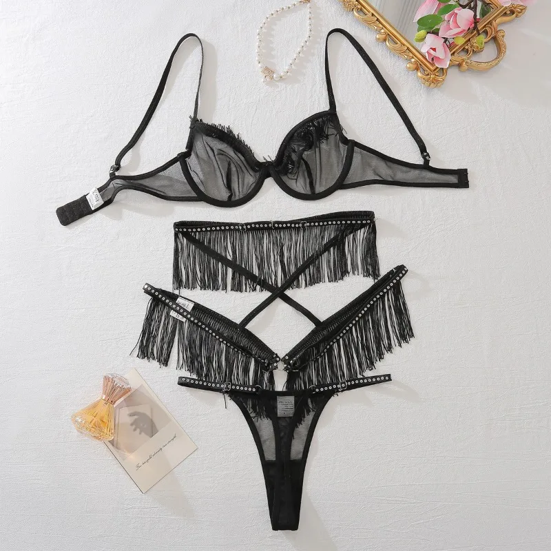 Tornova Sexy Lingerie Suit for Women Tassels Hollow Out See-through Underwear 3-piece Set Mesh Patchwork Tassels Sexy Underwear