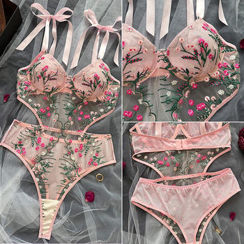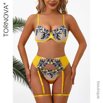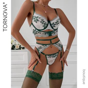 Tornova Sexy Lingerie Suit for Women Sexy Embroidery Bra with Steel Ring Garter Mesh Patchwork Perspective Sexy Lingerie Set New