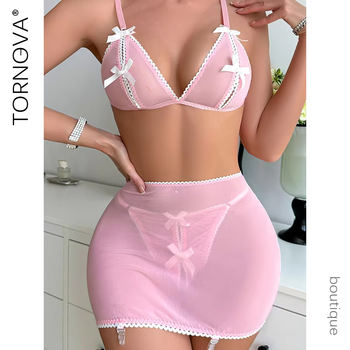 Tornova Sexy Lingerie Mesh Embroidery Printing Patchwork Micro Perspective Girdle Garters Underwear Set Women Sexy Underwear New