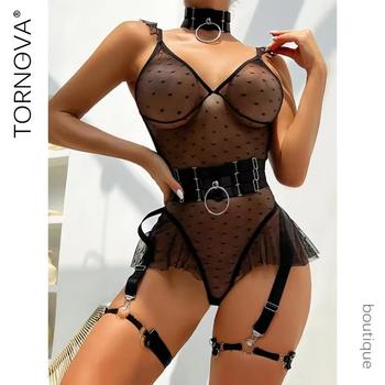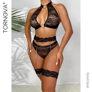 Tornova Sexy Underwear Uncensored Sexy Female Lingerie Mesh Patchwork Halter Women’s Underwear Suit Sexy Garters Lingerie Set