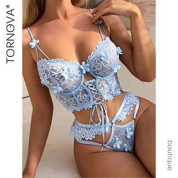 Tornova Sexy Lingerie Strap Underwire Lace Bra for Women Sexy Beaded 3D Flower Hollow Out See-through Lace Up Underwear Set New