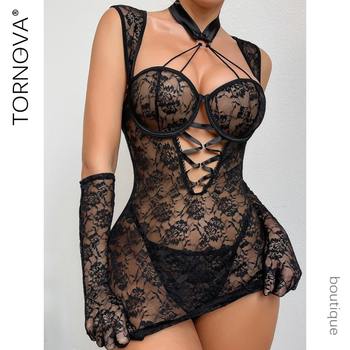 Tornova Sexy Sleeping Skirt Thong with Gloves Patchwork See-through Lace Hollowout Slim Hot Girl Interesting Elegant Pajamas Set