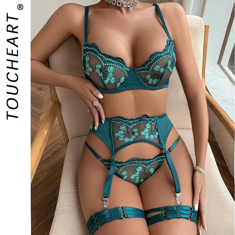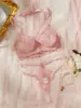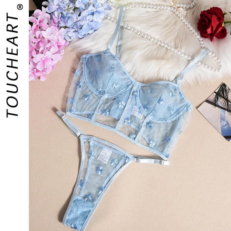 Toucheart Sexy Lingerie Comfortable Ultra-Thin Sexy Lace Printing Patchwork Mesh Semi-Transparent Push-Up Pink Underwear Set New