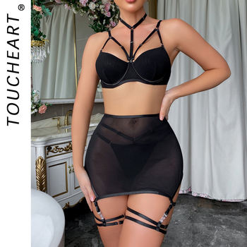 Toucheart 3 Piece Set Sexy Lingerie Lace Mesh Patchwork See-Through Temptation Bra Skirt Thong For Women Sexy Underwear Suit New