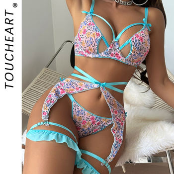 Toucheart Sexy Sexy Underwear Hollow Suit For Women Hot Girl Floral Pattern Splicing Bow Knot Lace Up Lace Garters Underwear Set