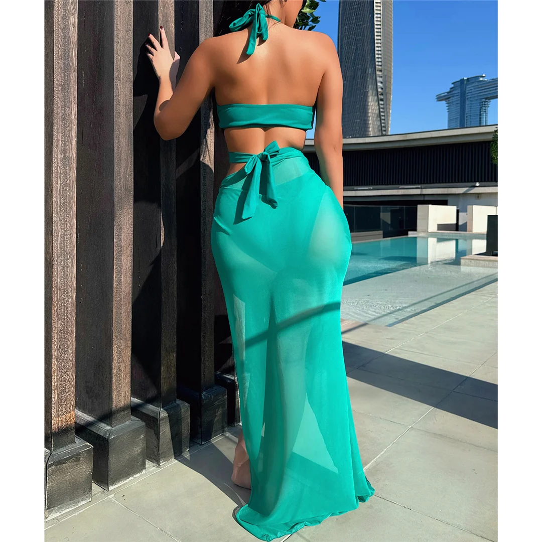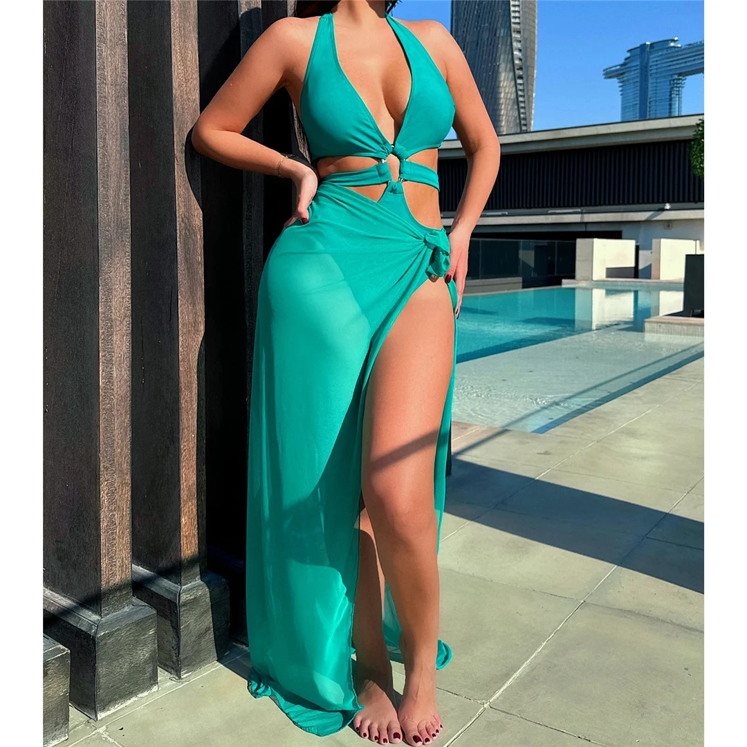 With Sarong Deep V Neck Cut Out Halter Women Swimwear One Piece Swimsuit Female Monokini Padded Bather Bathing Suit Swim V6483