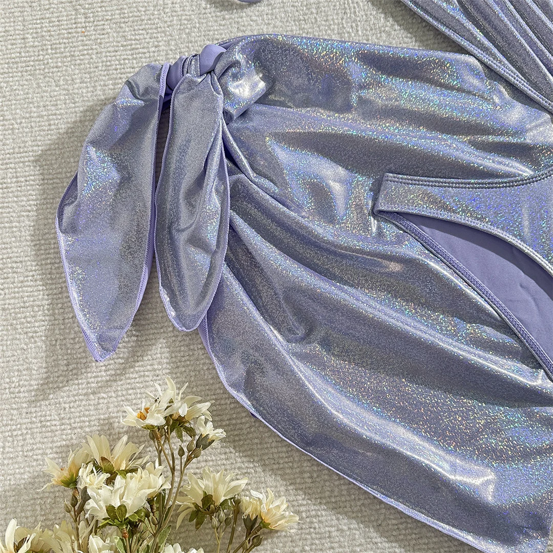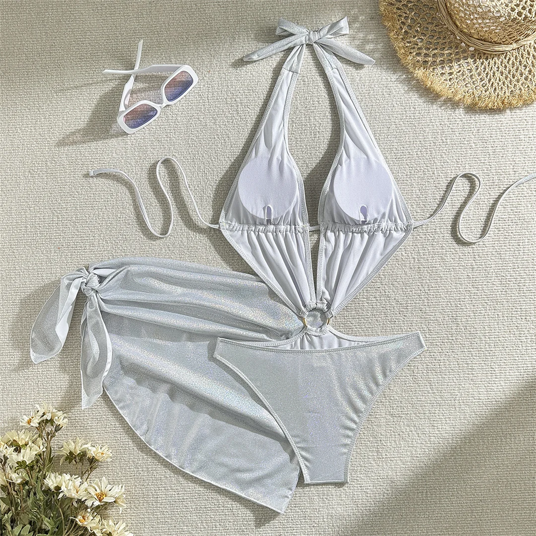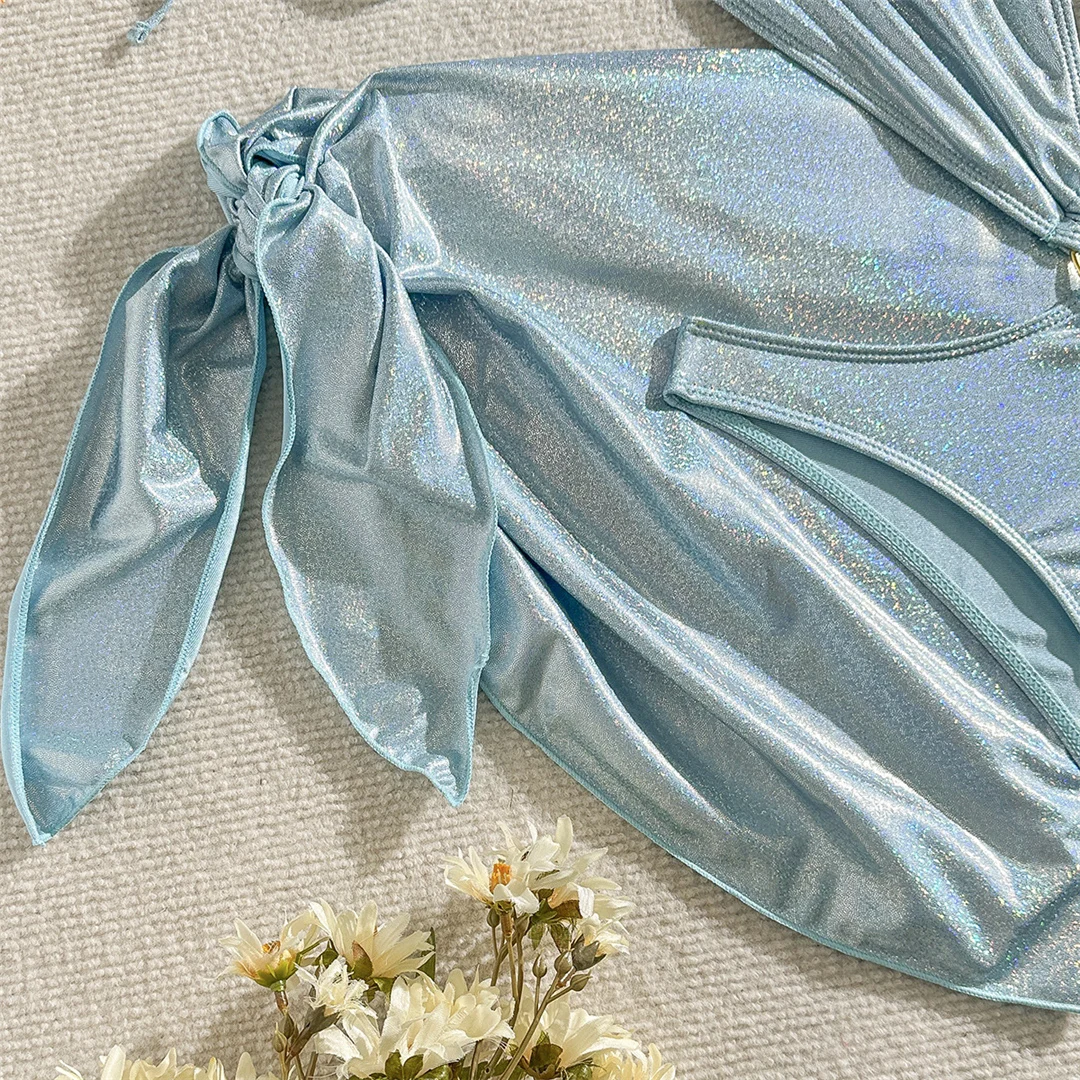 With Sarong Glitter Sparkling Depp V Neck One Piece Swimsuit Women Swimwear Female Cut Out Halter Bather Bathing Suit Swim V5754