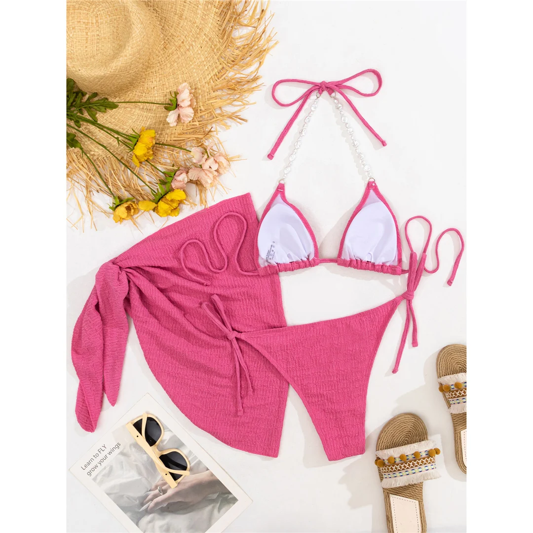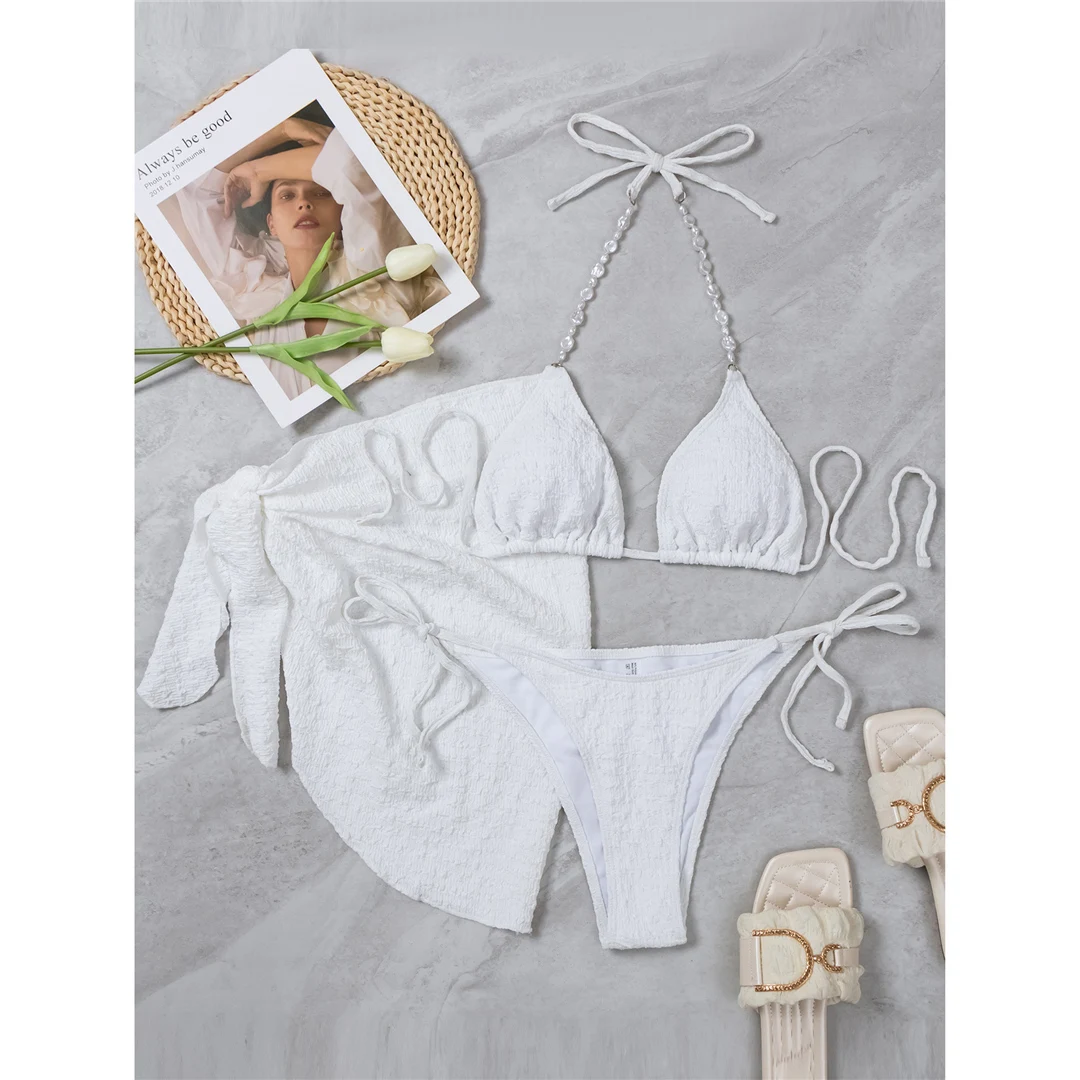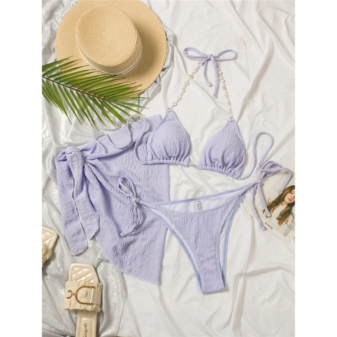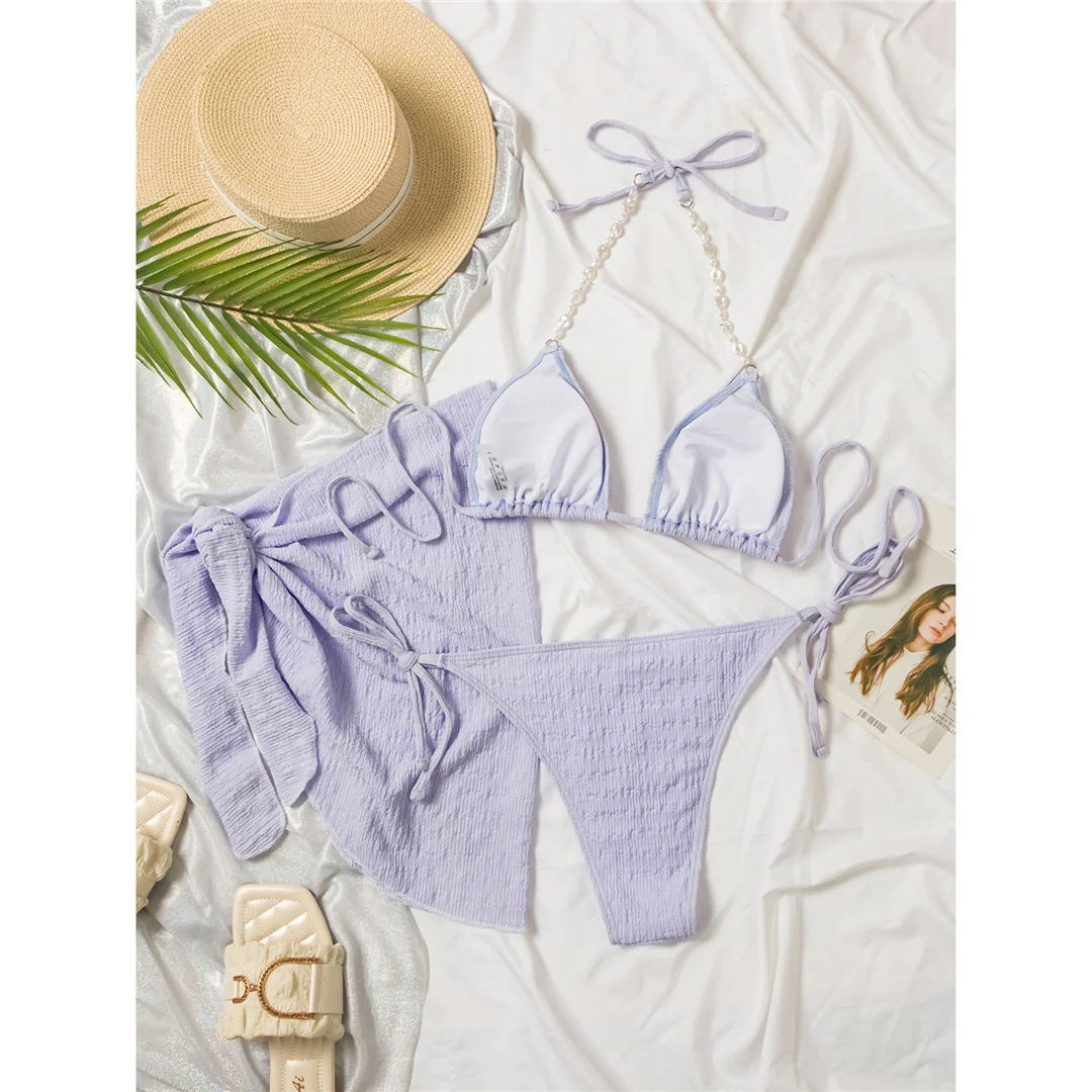 With Sarong Halter Pearls Wrinkled Bikini Women Swimwear Female Swimsuit Three-pieces Bikini set Bather Bathing Suit Swim V5593