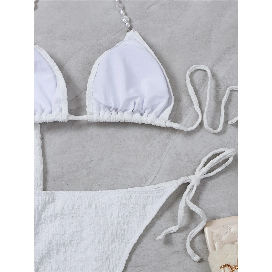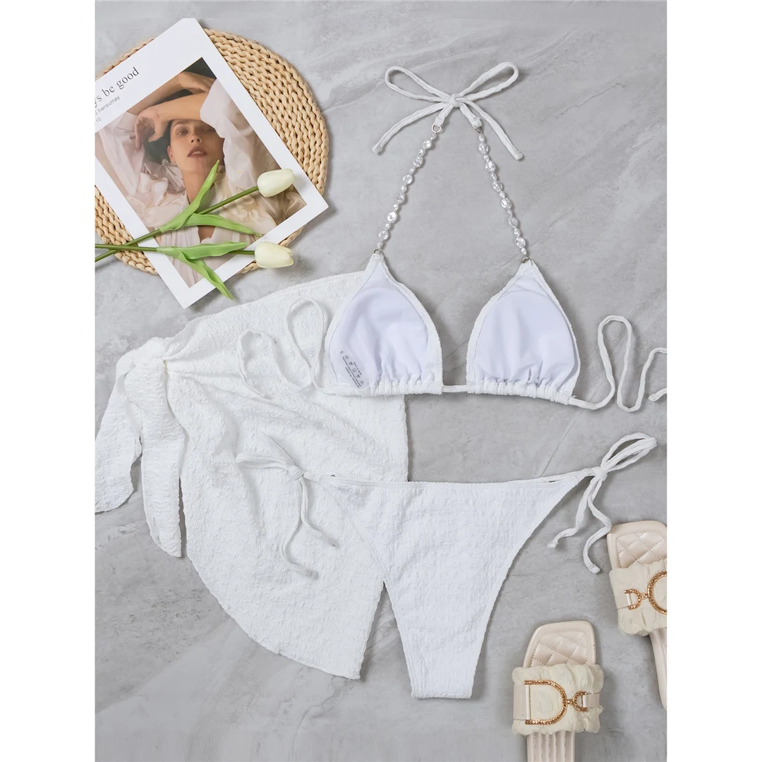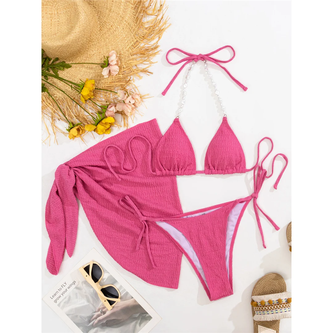 With Sarong Halter Pearls Wrinkled Bikini Women Swimwear Female Swimsuit Three-pieces Bikini set Bather Bathing Suit Swim V5593