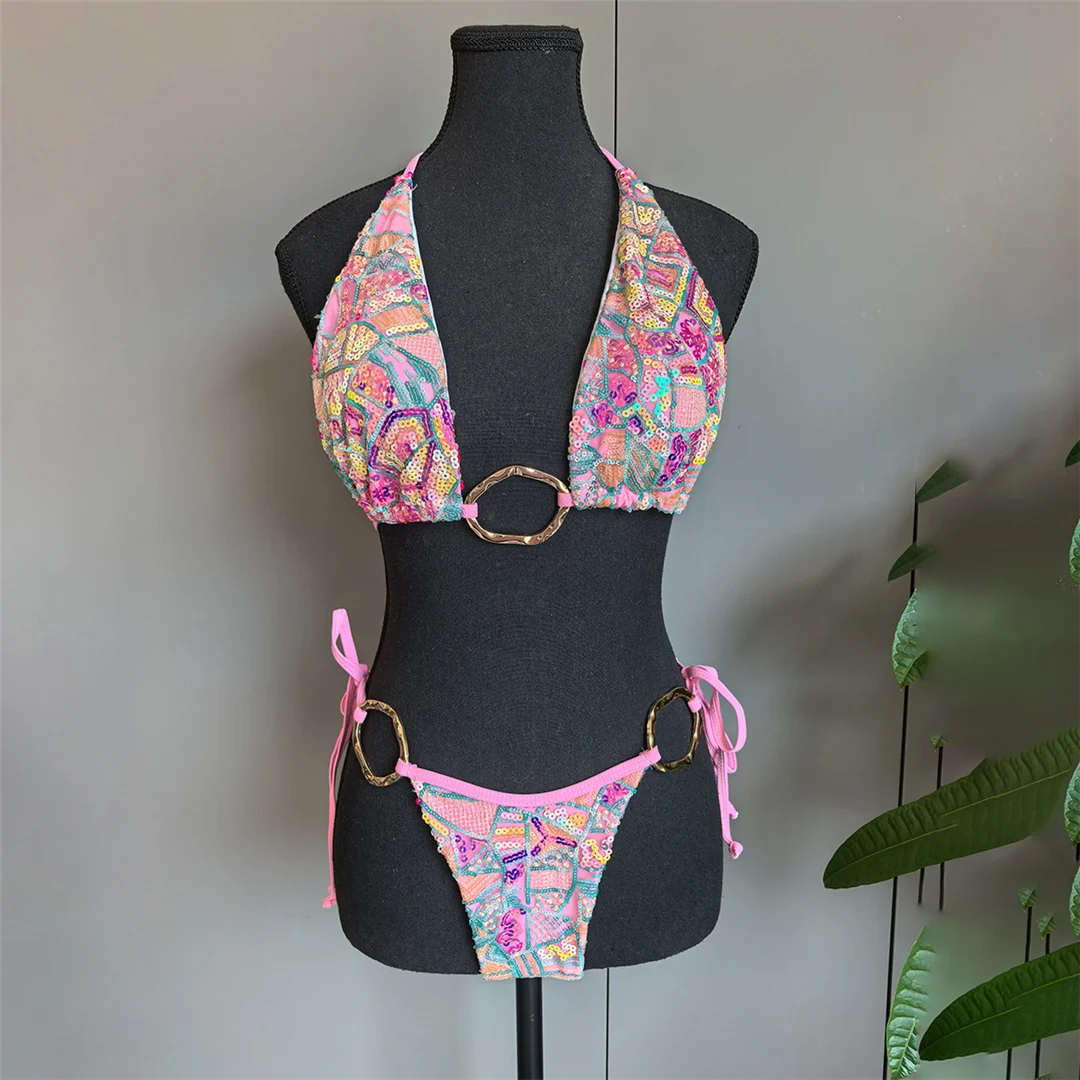 With Sarong Printed Sequins Bikini Female Swimsuit Women Swimwear Three-pieces Bikini set Padded Bather Bathing Suit Swim V7420