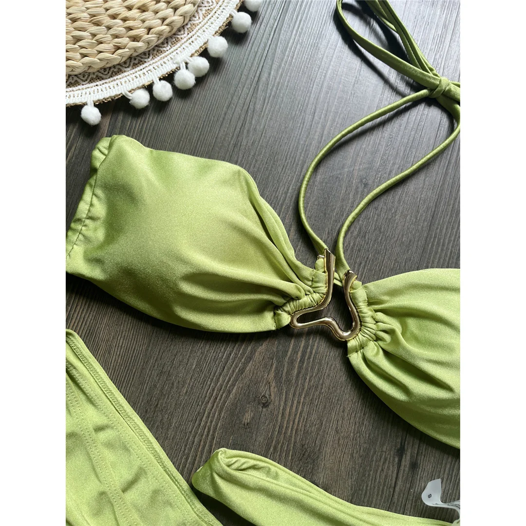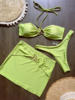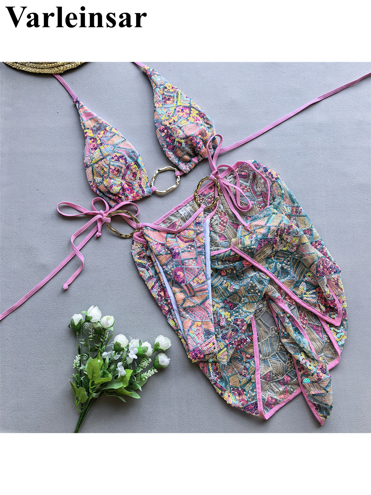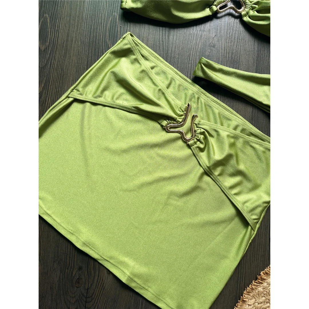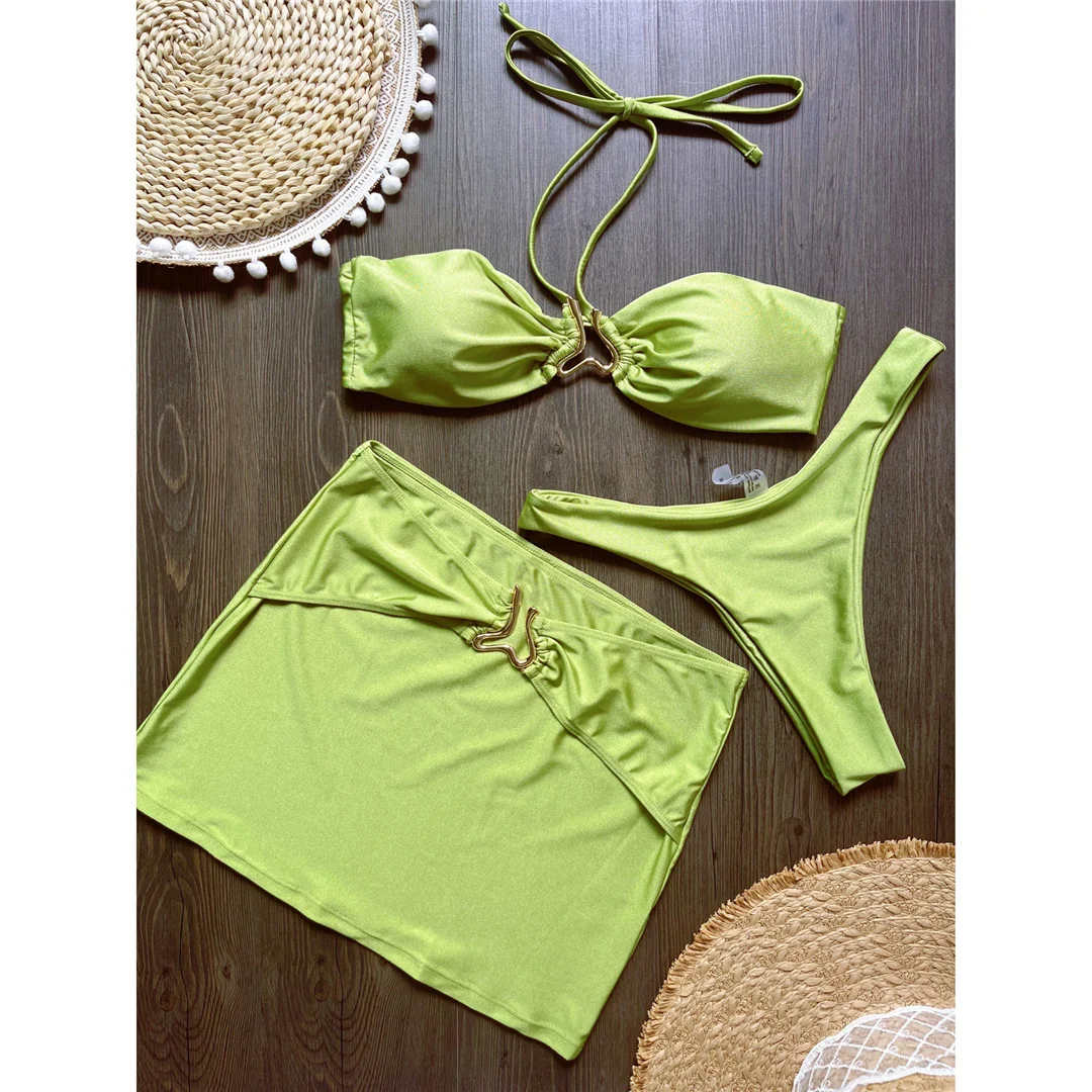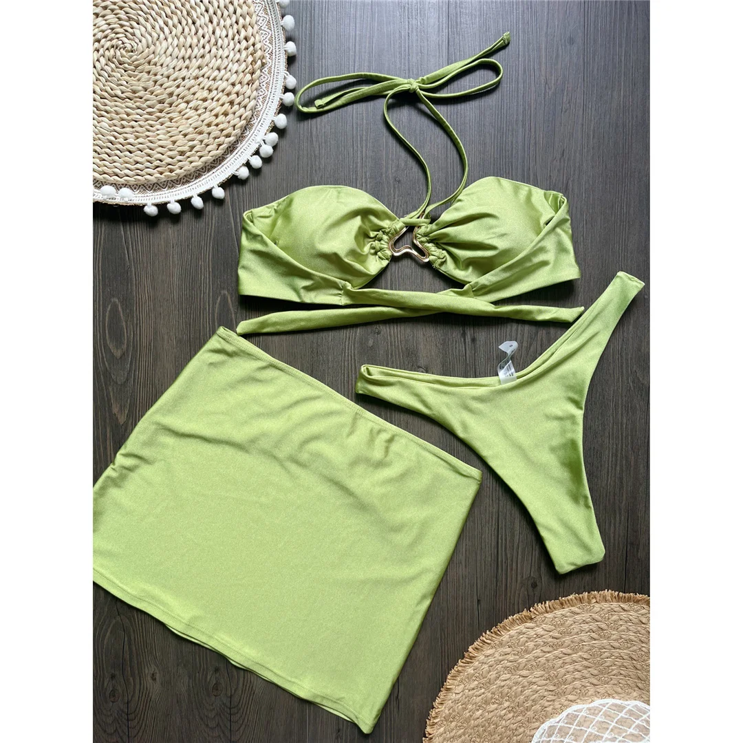 With Skirt Halter Metal Ring Bikini Women Swimwear Female Swimsuit Three-pieces Bikini set Padded Bather Bathing Suit Swim V7304