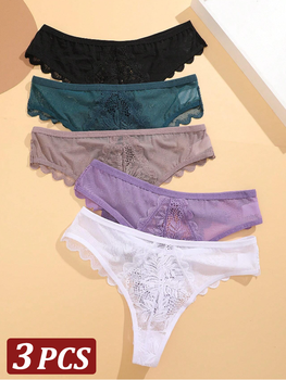 FINETOO 3Pcs/Set Sexy Lace Thongs Women Solid G-String Panties Floral Perspective Underwear Female Soft Breathable Lingerie