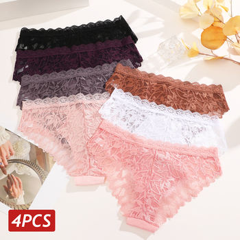 4PCS Floral Lace Panties for Women Low RiseBreathable Briefs Female Comfortable Underwear Solid Color Intimates Sexy Lingerie