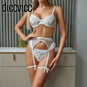 Diccvicc Lingerie Sexy Cut Out Bra Ruffle Garter Thong Floral Embroidery Lace Transparent Women Underwear Uncensored Exotic Set