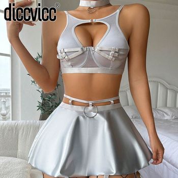 Diccvicc Lingerie Sexy Coating Fabric Cut Out Bandage Bra Top Garter Set Women Underwear Fancy Dress Exotic Intimate Outfit Kits