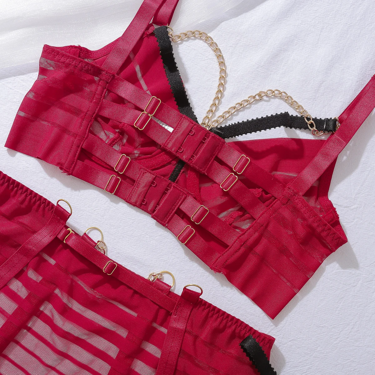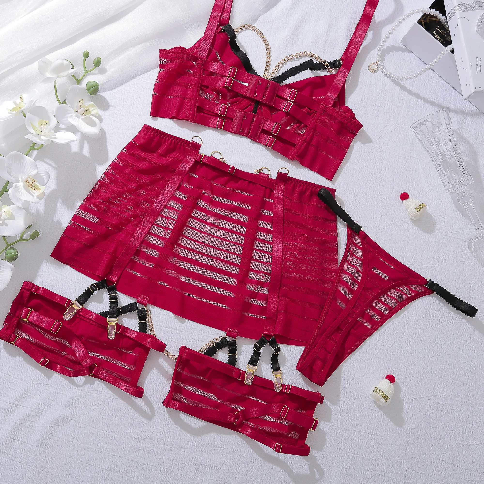 Women’s Cross Tie Underwear Set Club Lace Striped Breast Enhancement Strap Sexy Metal Chain Underwear 5-piece Set