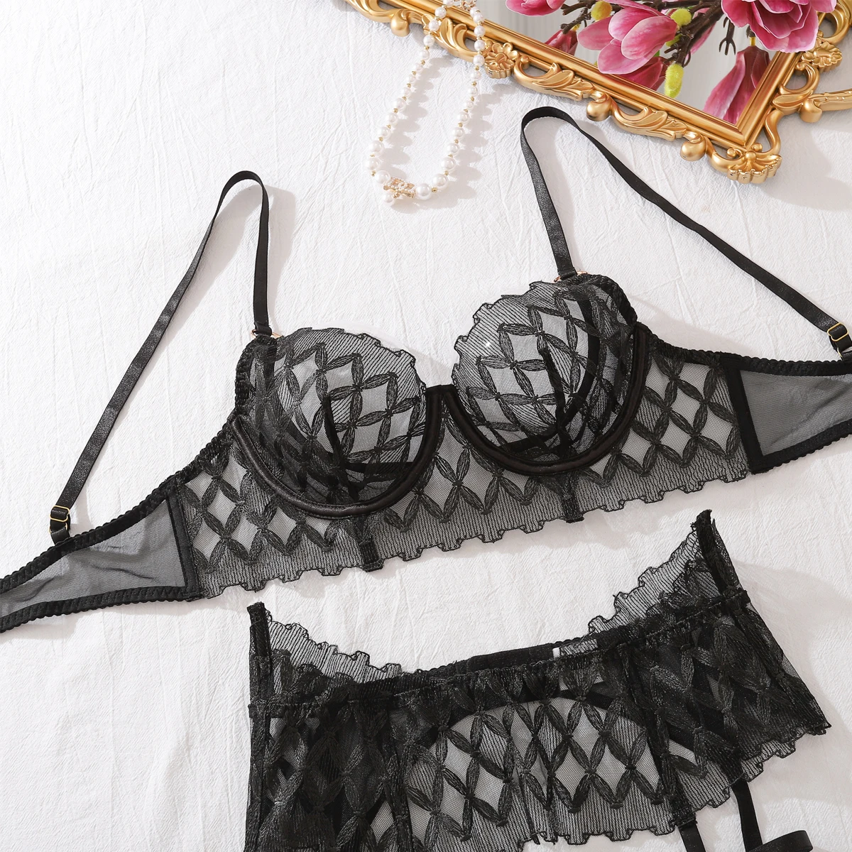 Women’s Luxury Sexy Fashion Lace Bra Set Geometric Style Mesh see-through Shaping Exotic Lingerie Panty four-piece Set