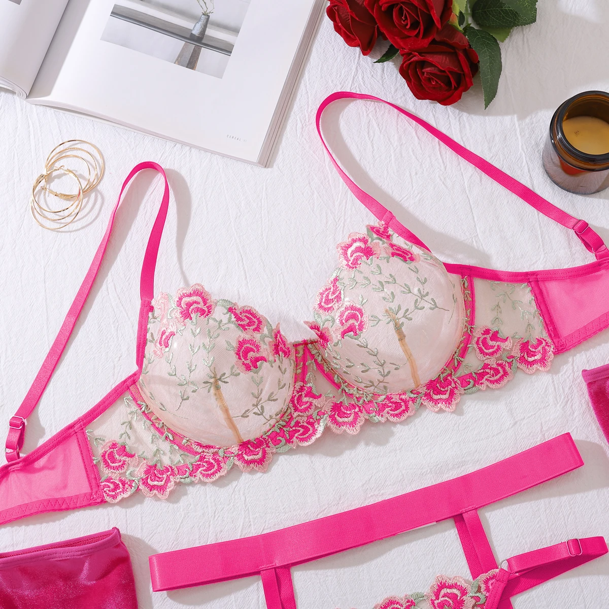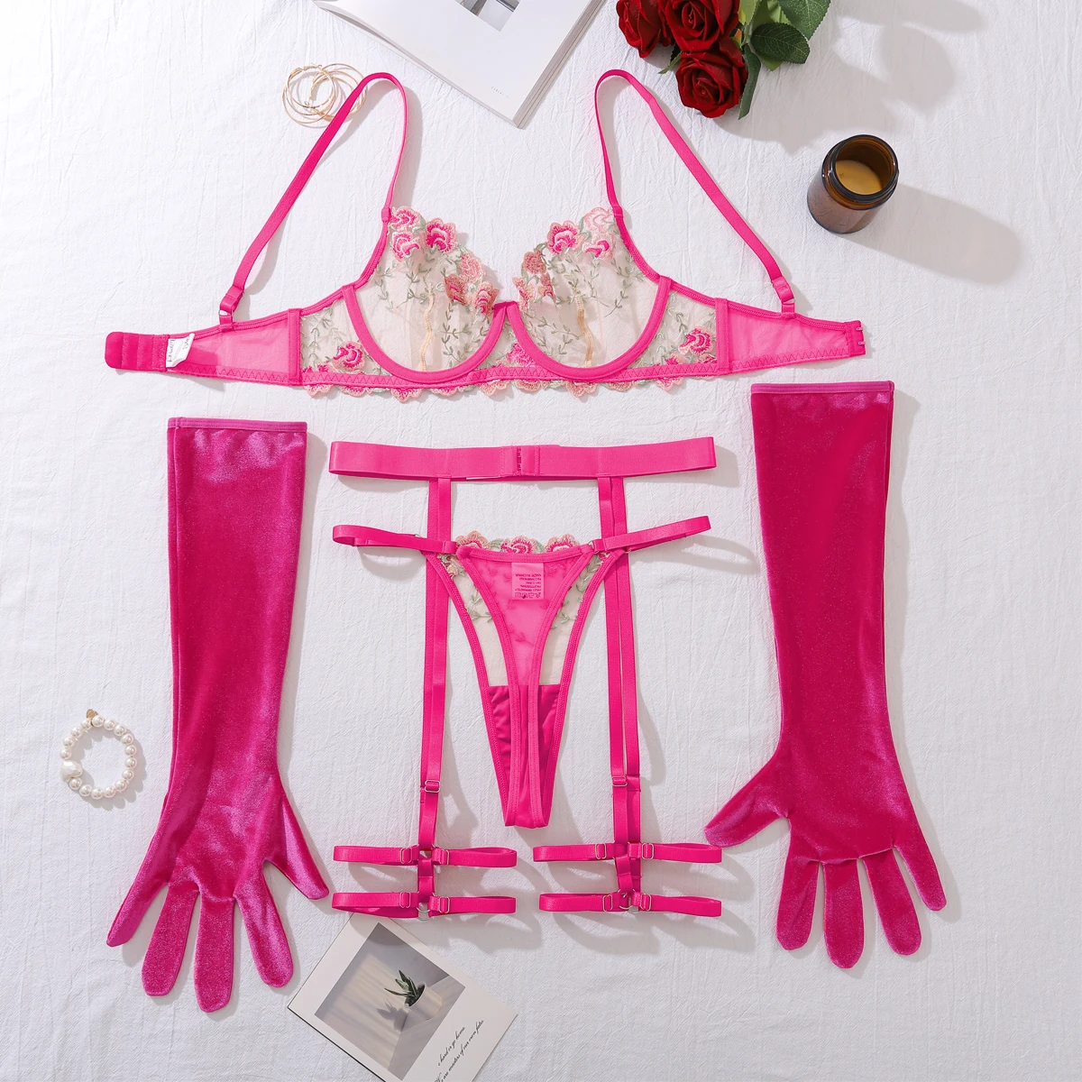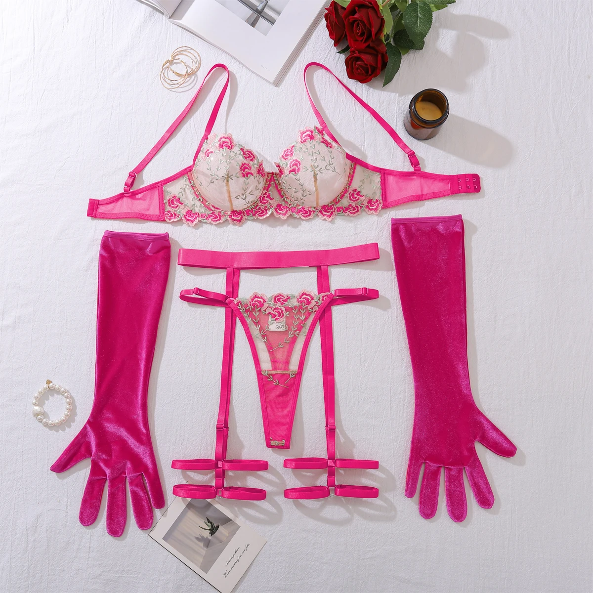 Women’s sexy floral embroidery luxury bra lace mesh transparent hollow backless erotic exotic lingerie panties set of four