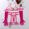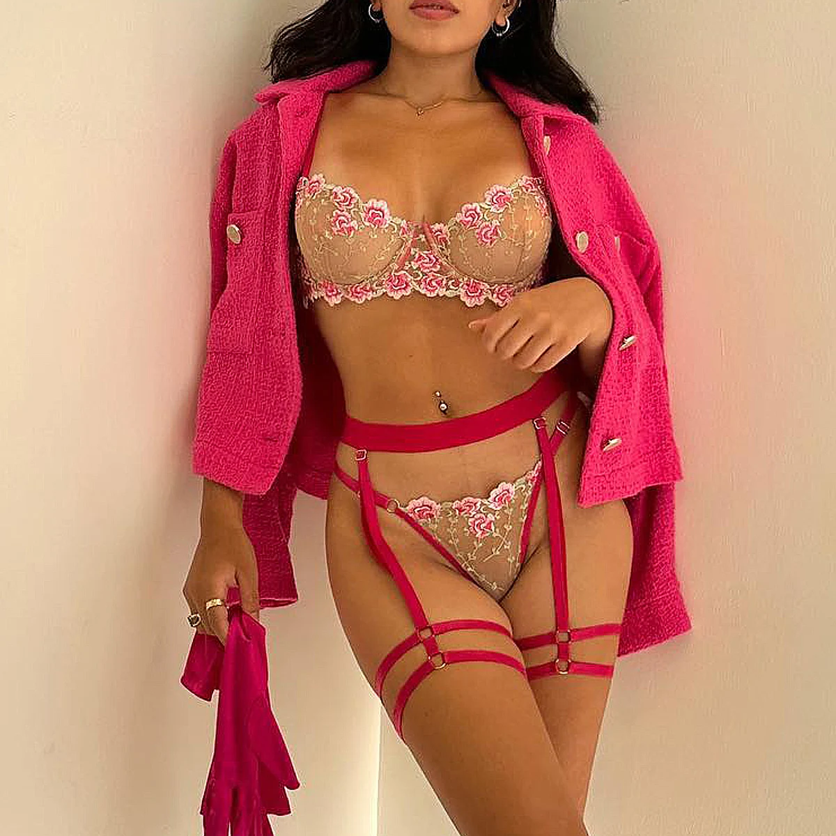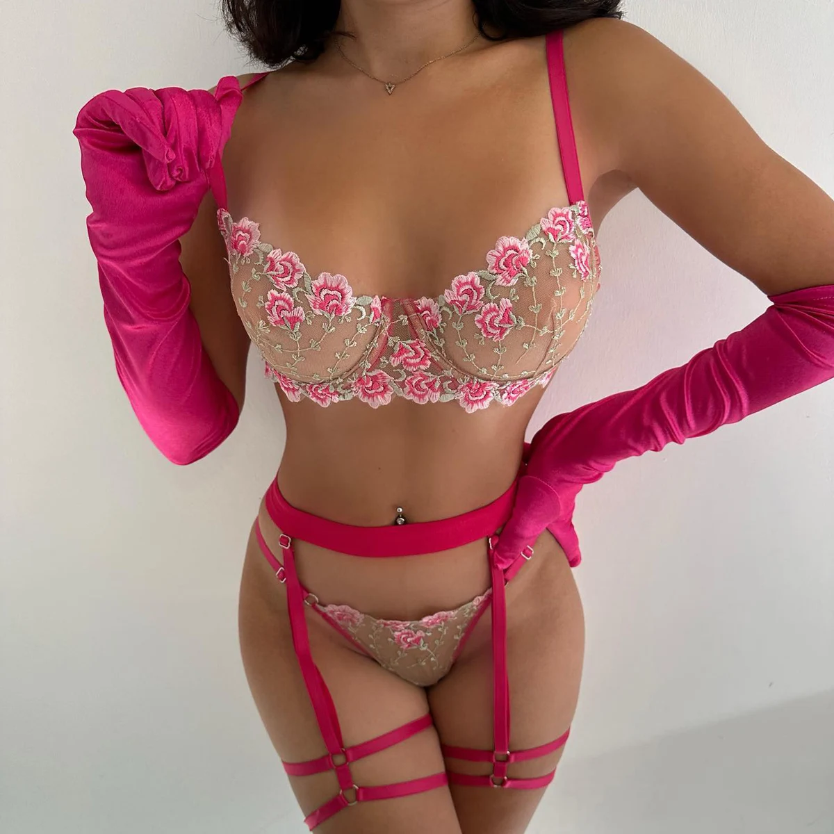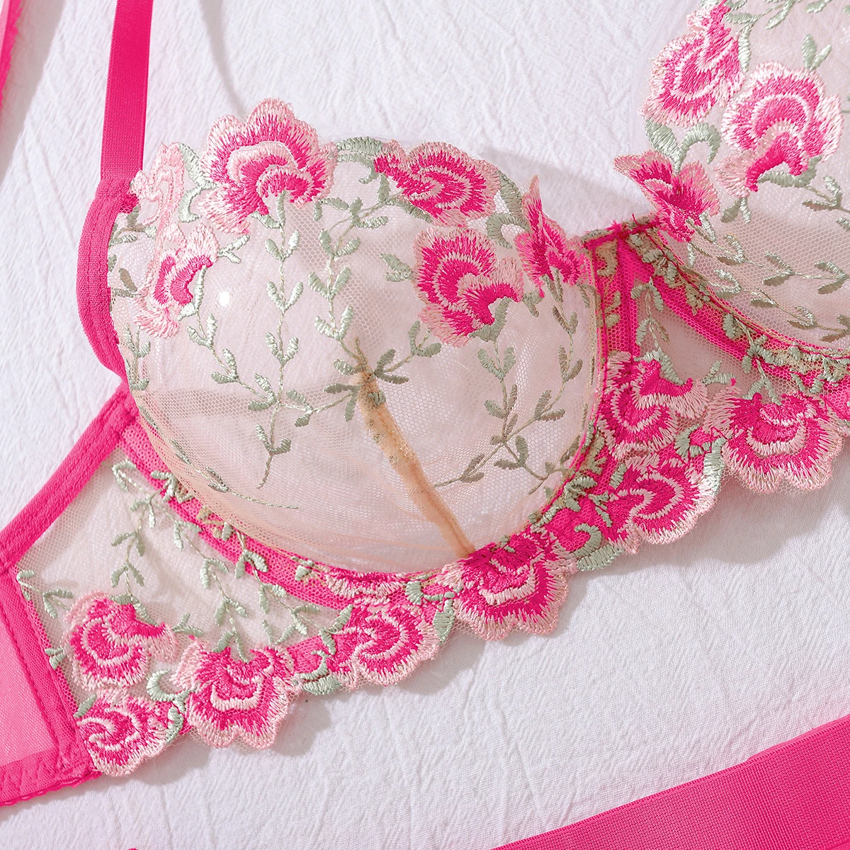 Women’s sexy floral embroidery luxury bra lace mesh transparent hollow backless erotic exotic lingerie panties set of four