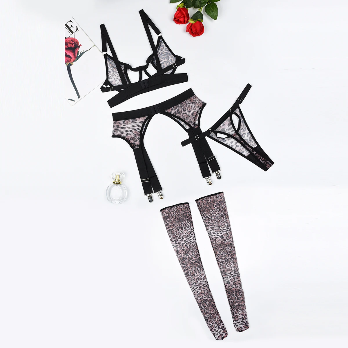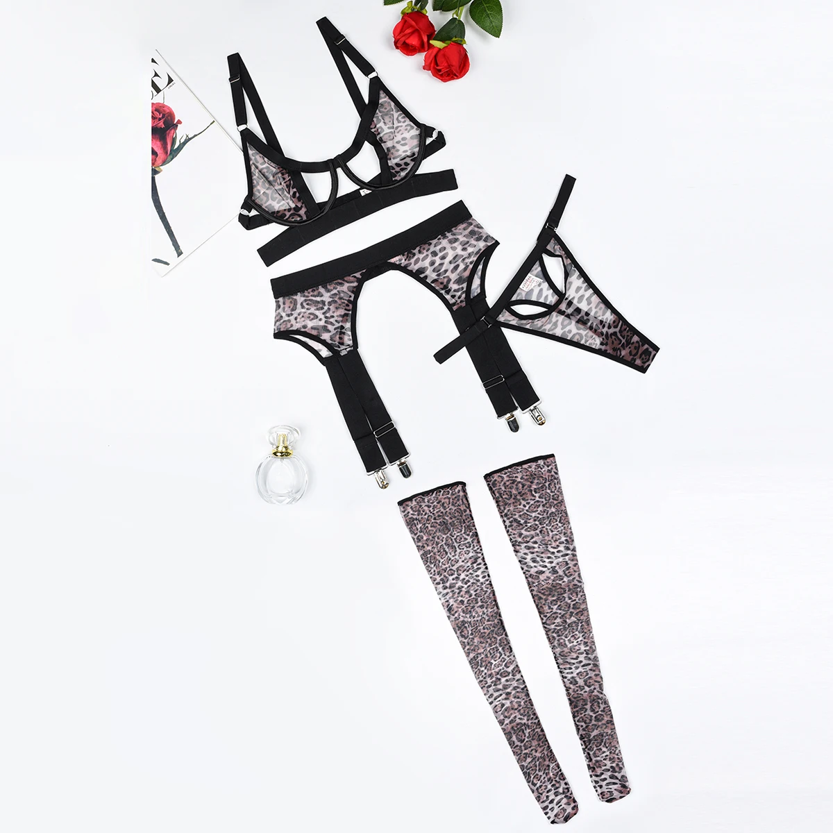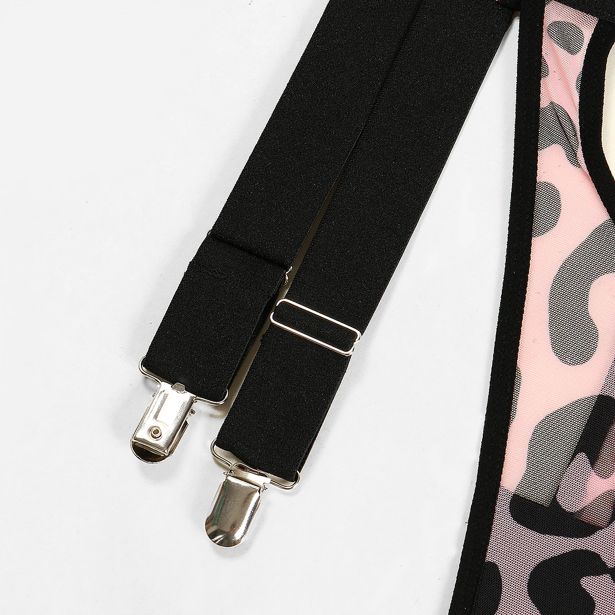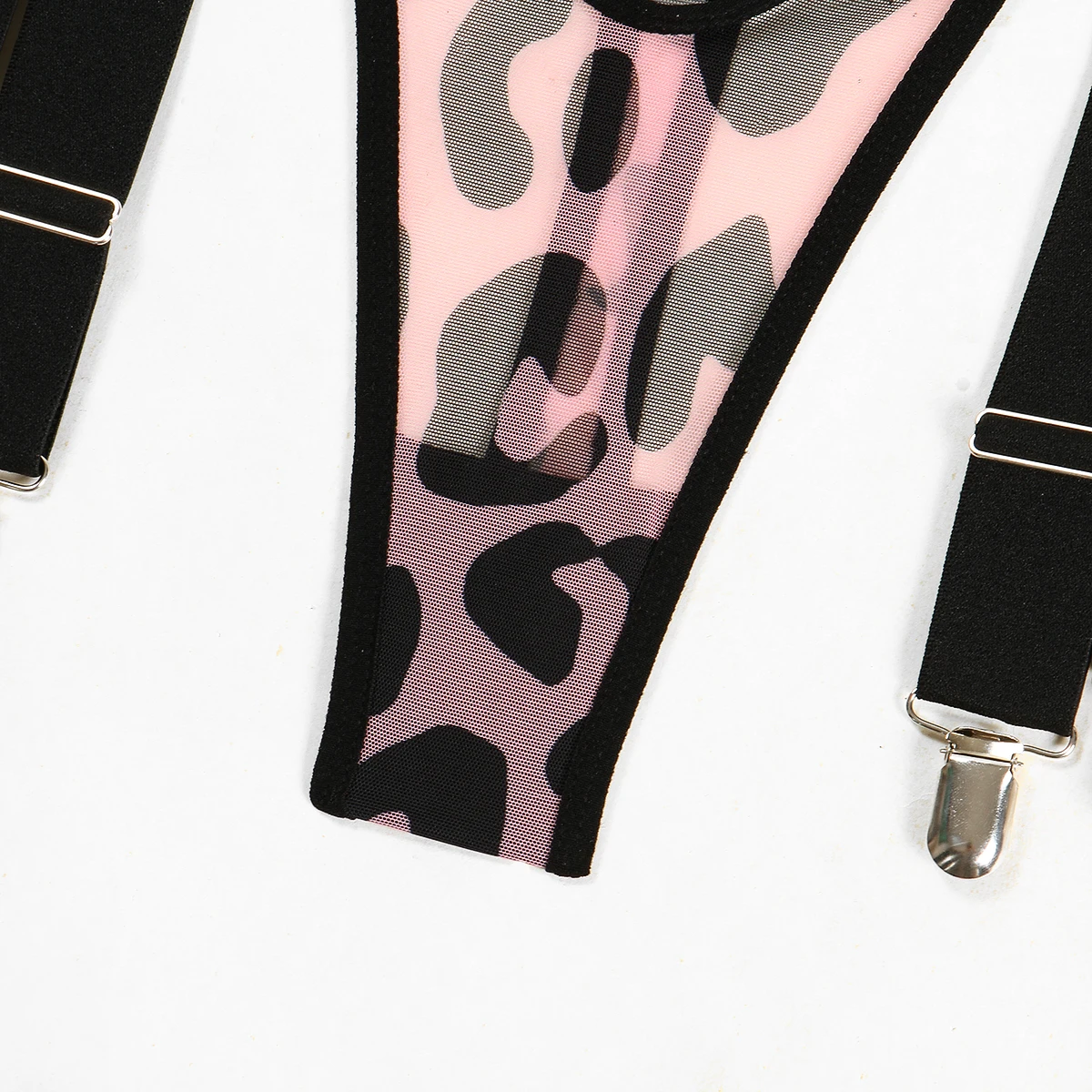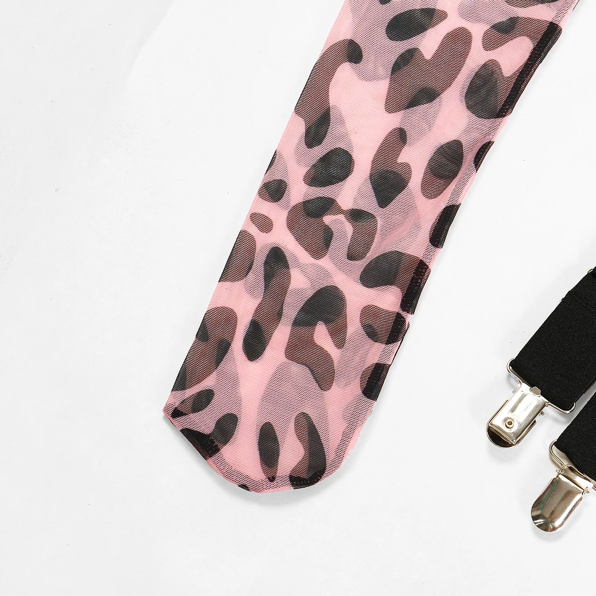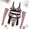 Women’s Sexy Lingerie Cut-out Pink Leopard Stockings Bra Erotic Set See-through Lace Fancy Lingerie Garter Set Of Four