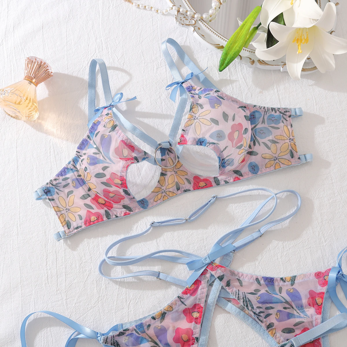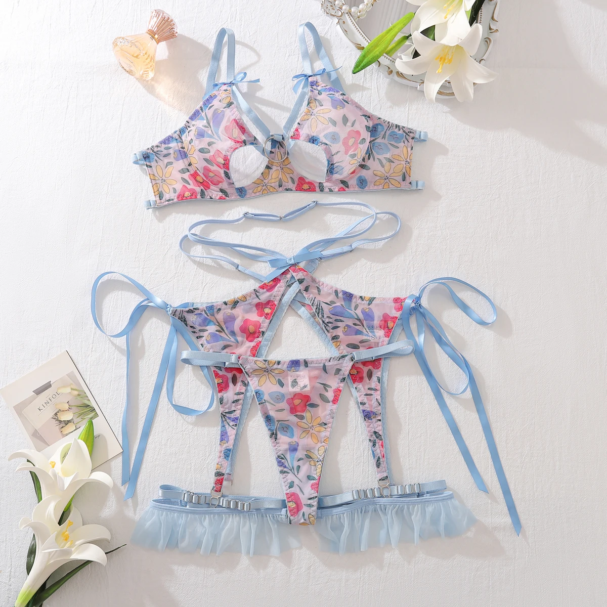 Women’s Sexy Lingerie Vintage Flower Hollow Out Bra Fancy Garter Belt Matching Erotic Lingerie Exotic Set of Three