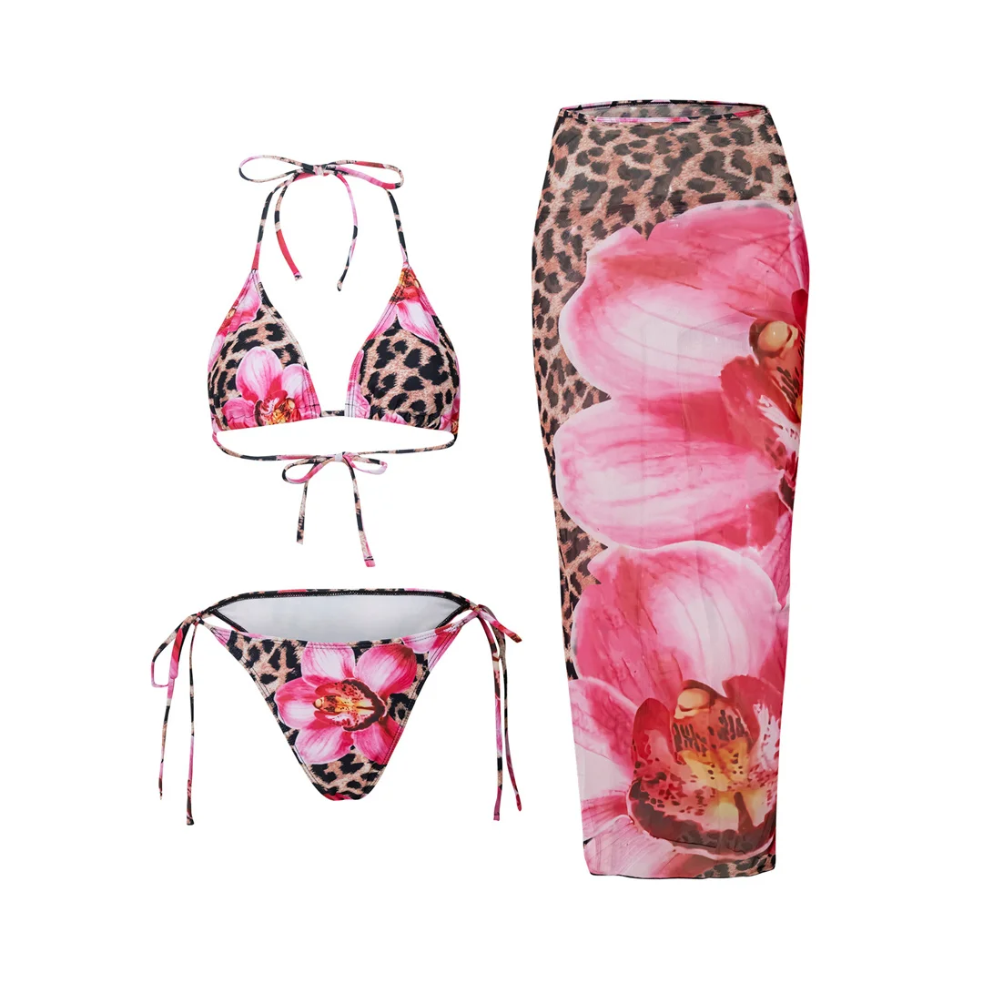 XS – L Floral Leopard With Skirt Bikini Female Swimsuit Women Swimwear Three-pieces Bikini set Bather Bathing Suit Swim V6788L