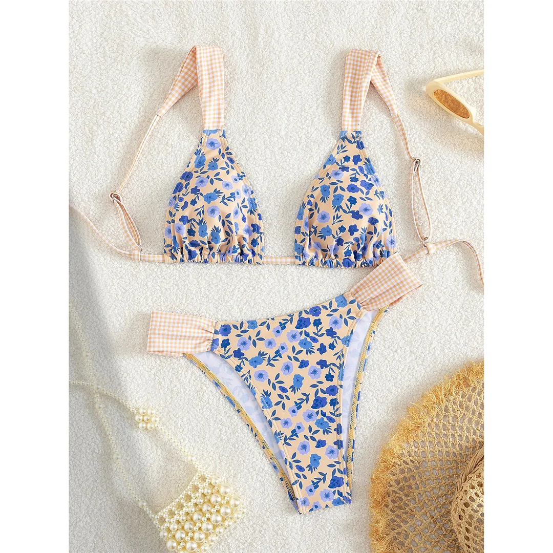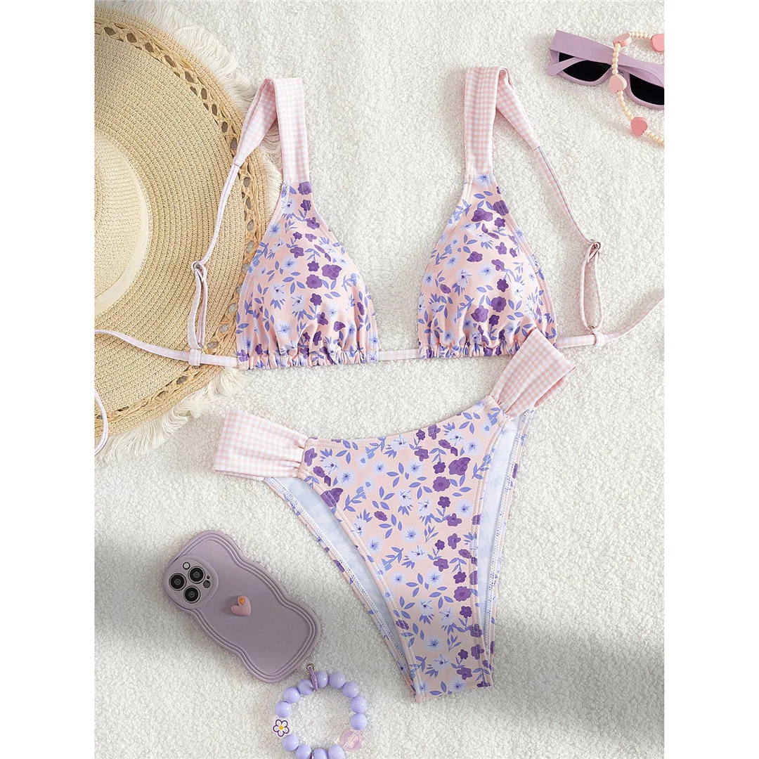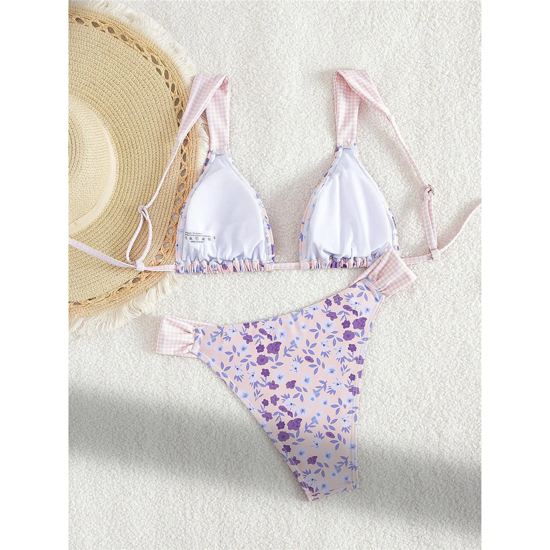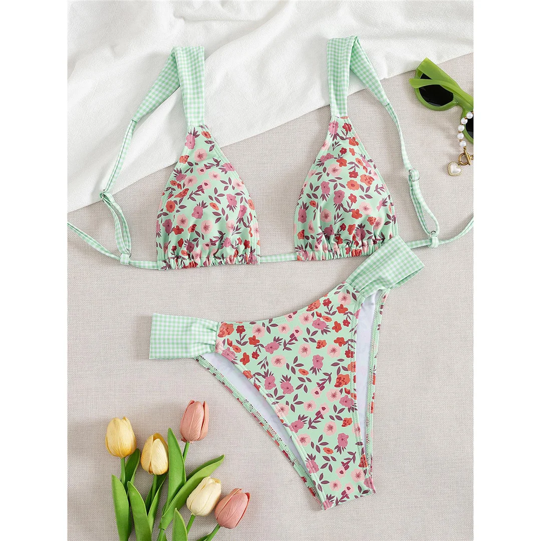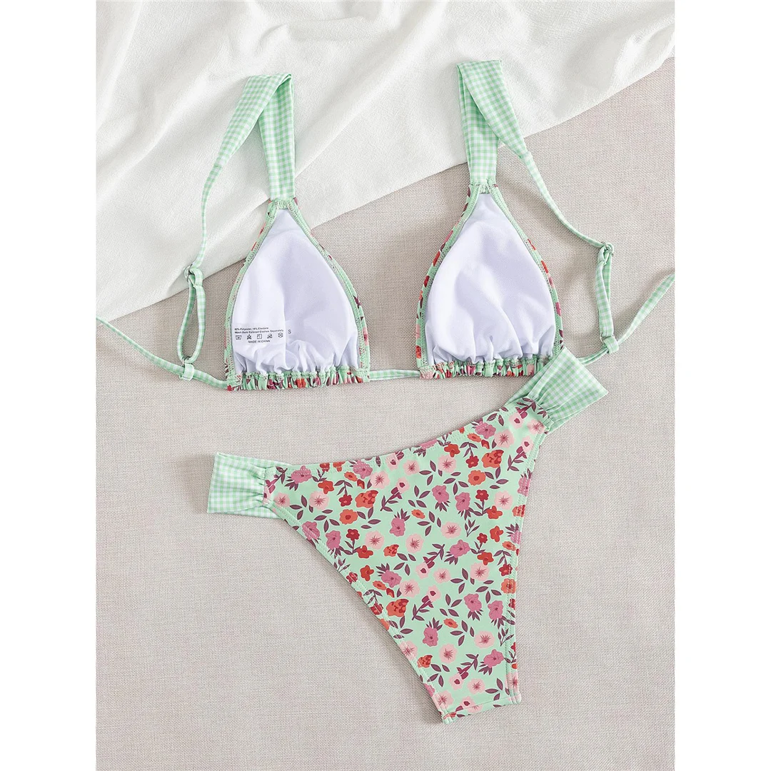 XS – L Flower Printed Splicing Bikini Female Swimsuit Women Swimwear Two-pieces Bikini set Padded Bather Bathing Suit Swim V7207