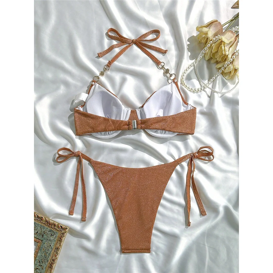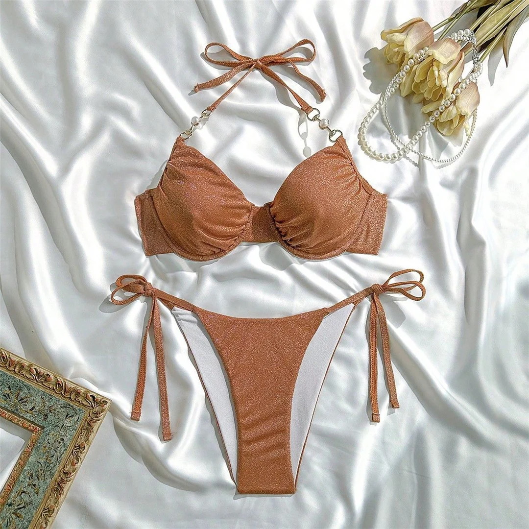 XS – L Shiny Halter Pearl Underwired Bikini Female Swimsuit Women Swimwear Two-pieces Bikini set Bather Bathing Suit Swim V6948