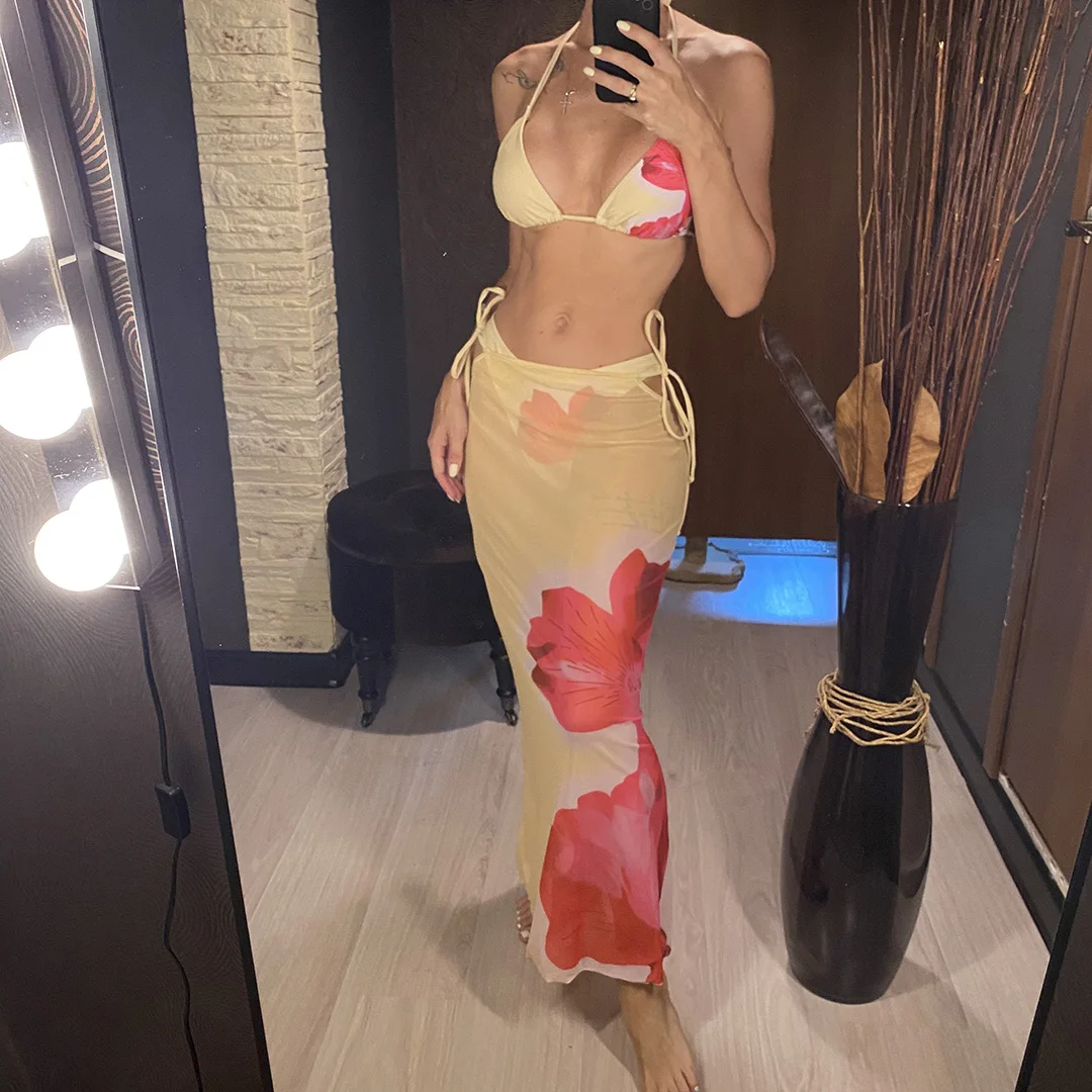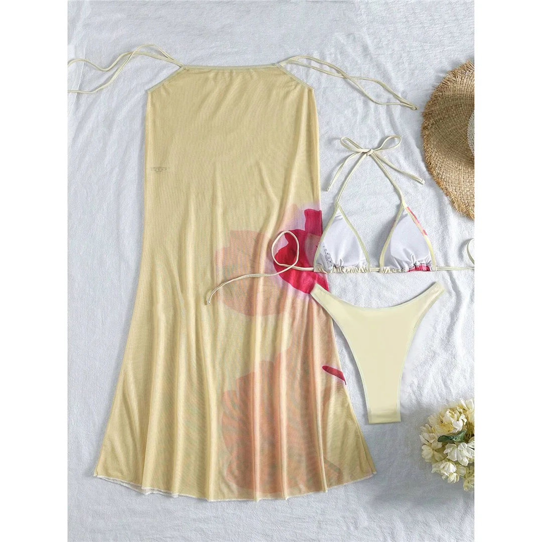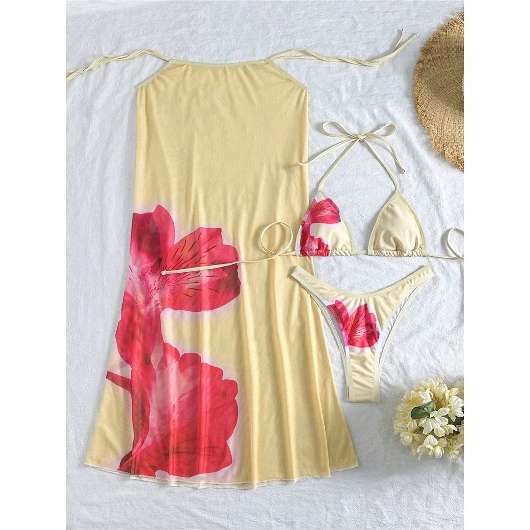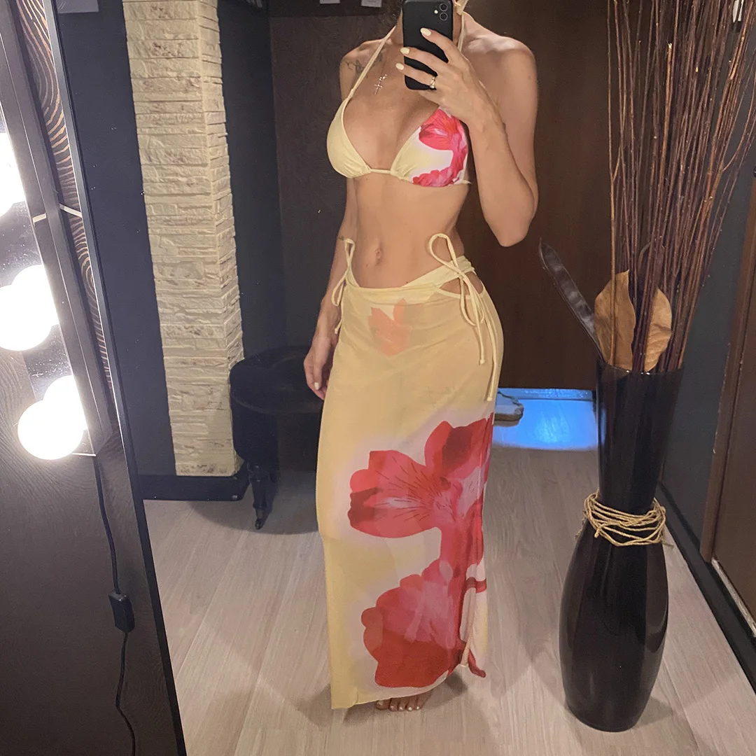 XS – L With Cover Up Flowers Halter Bikini Female Swimsuit Women Swimwear Three-pieces Bikini set Bather Bathing Suit Swim V6800