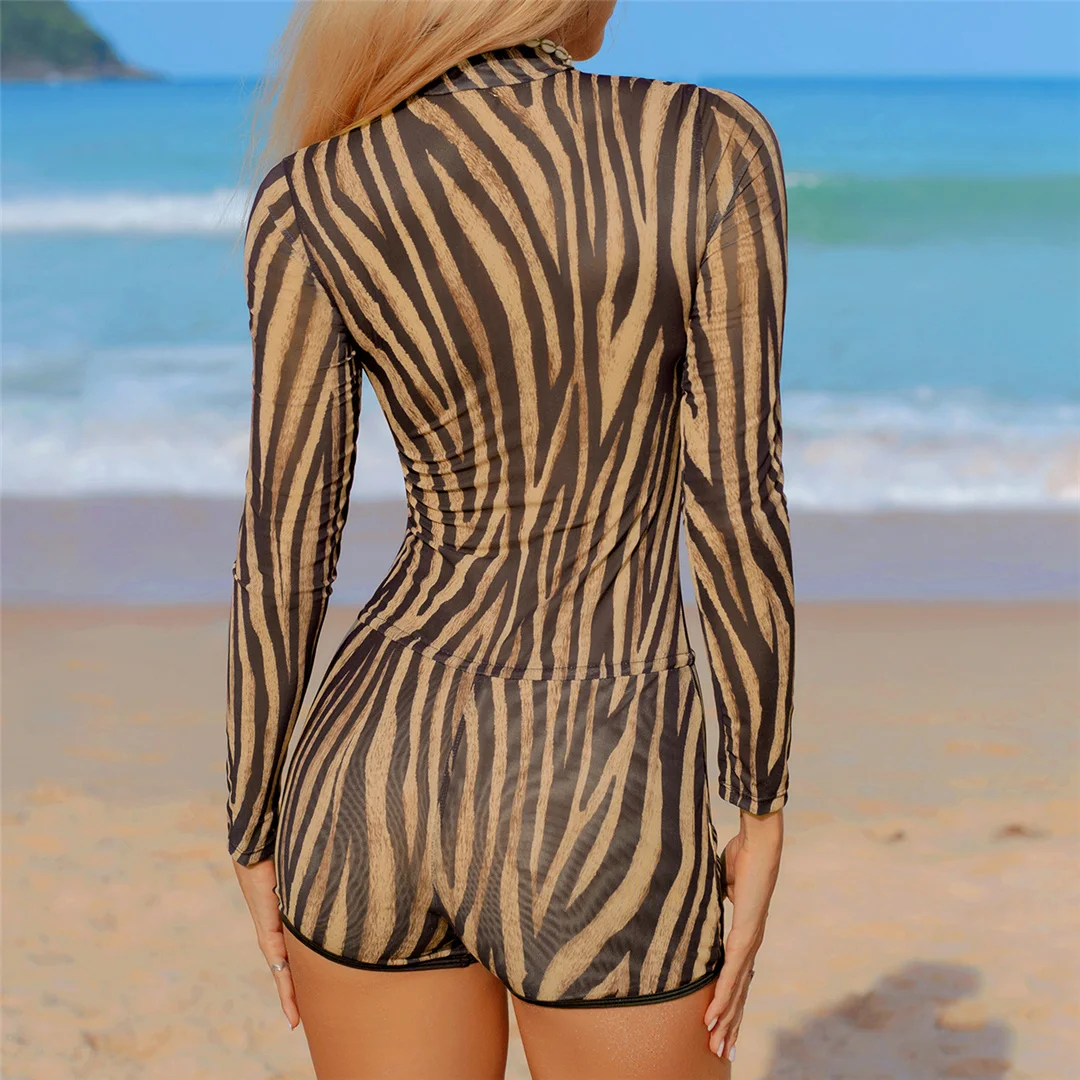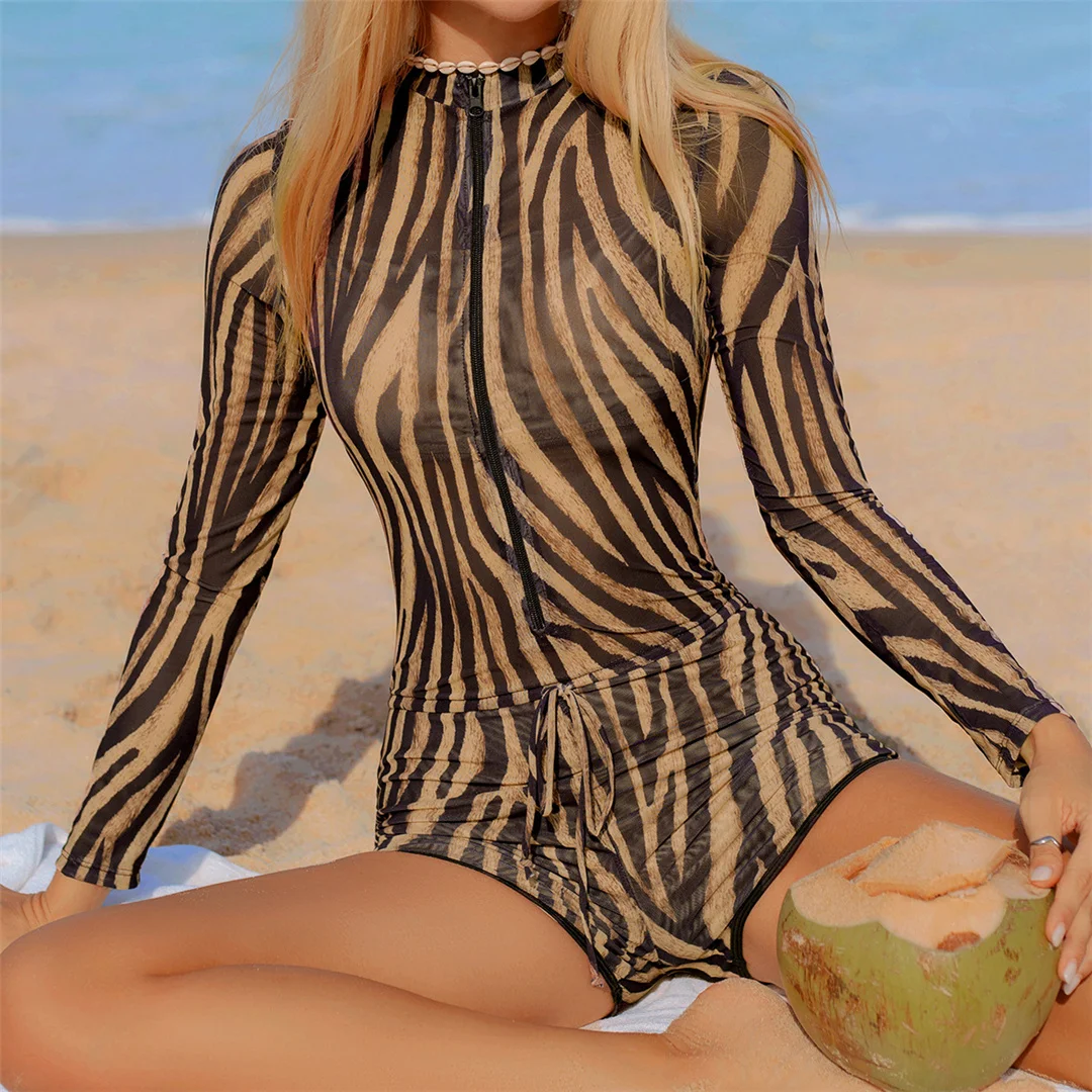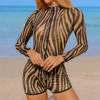 XS – XL New Striped Long Sleeve One Piece Swimsuit Women Swimwear Female Shorts Zipper Padded Bather Bathing Suit Swim V7196