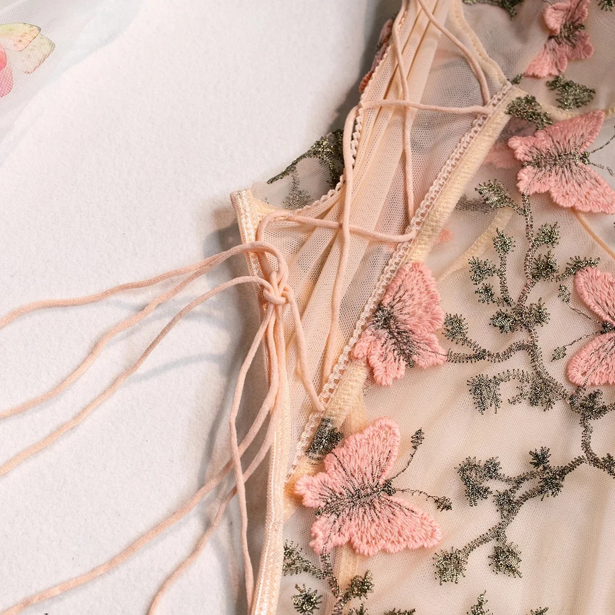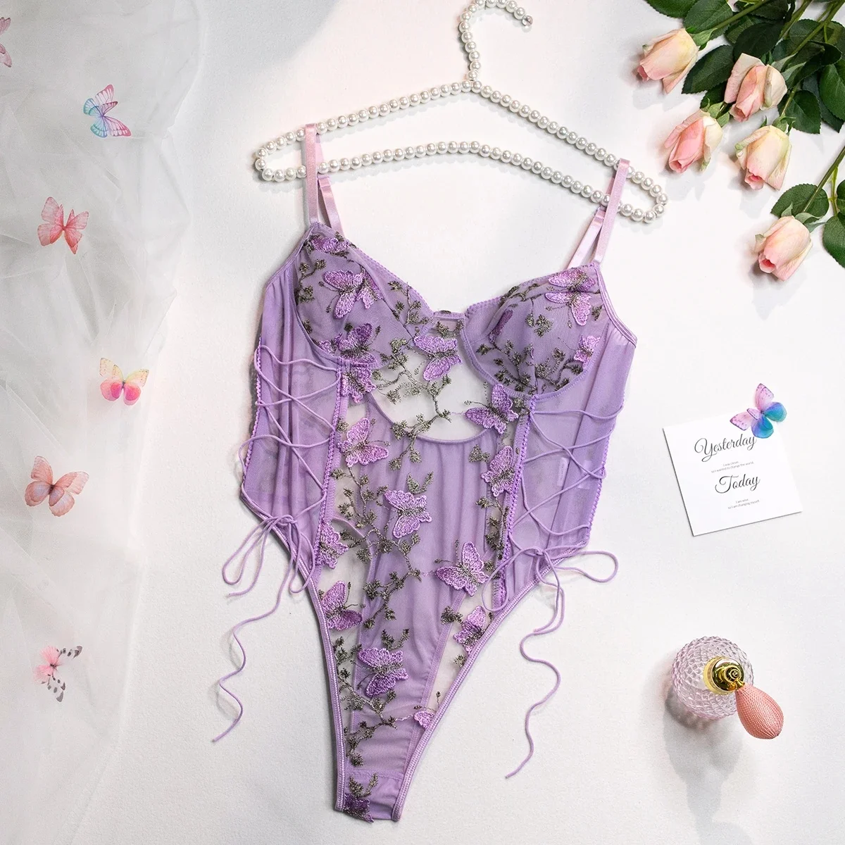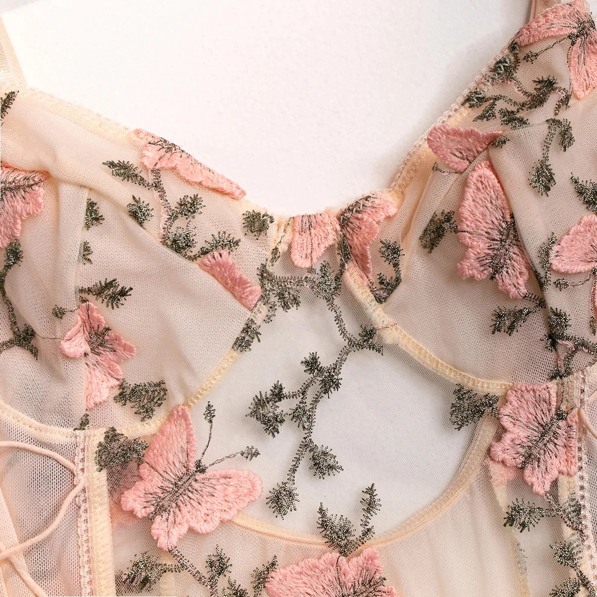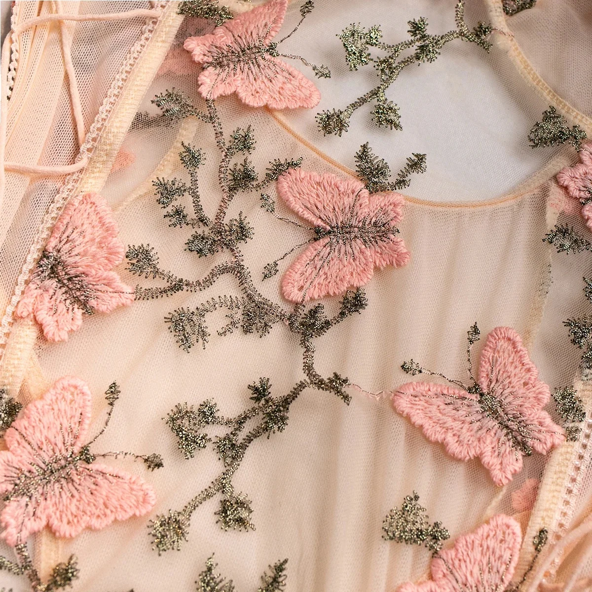 Yimunancy Boho Butterfly Embroidery Mesh Bodysuit Women Transparent Lace Up Sexy Bodysuit Body Femme