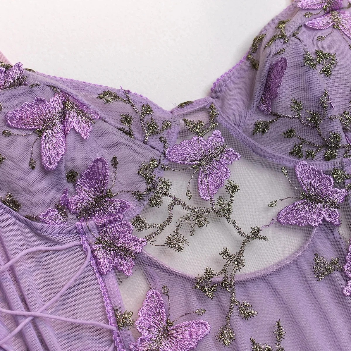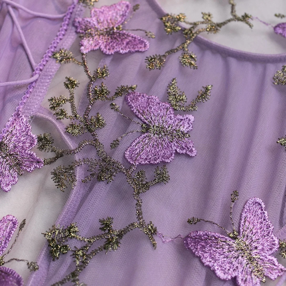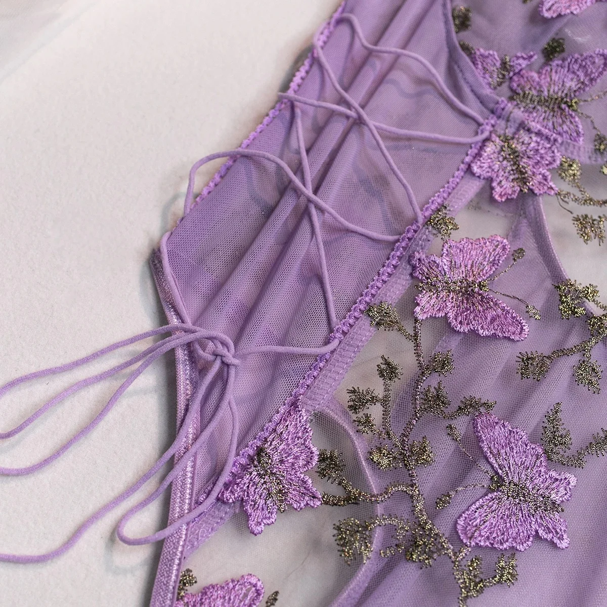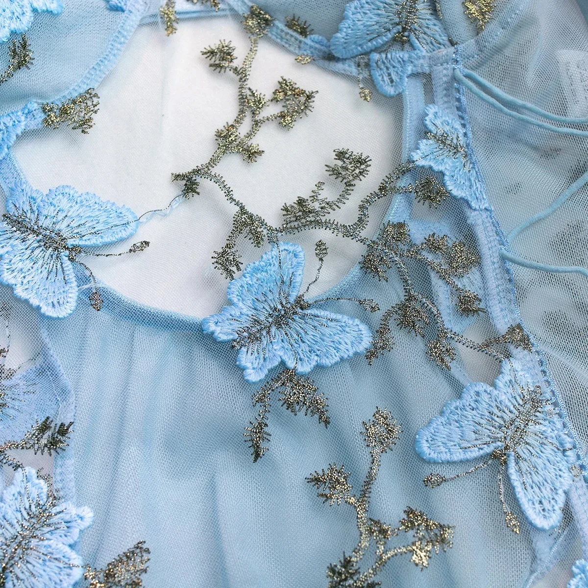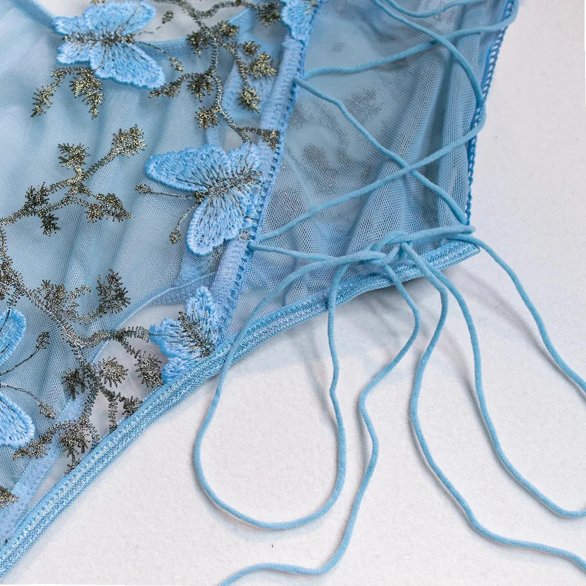 Yimunancy Boho Butterfly Embroidery Mesh Bodysuit Women Transparent Lace Up Sexy Bodysuit Body Femme
