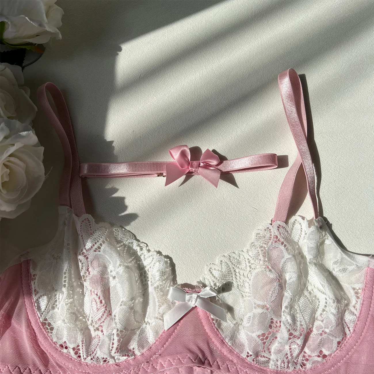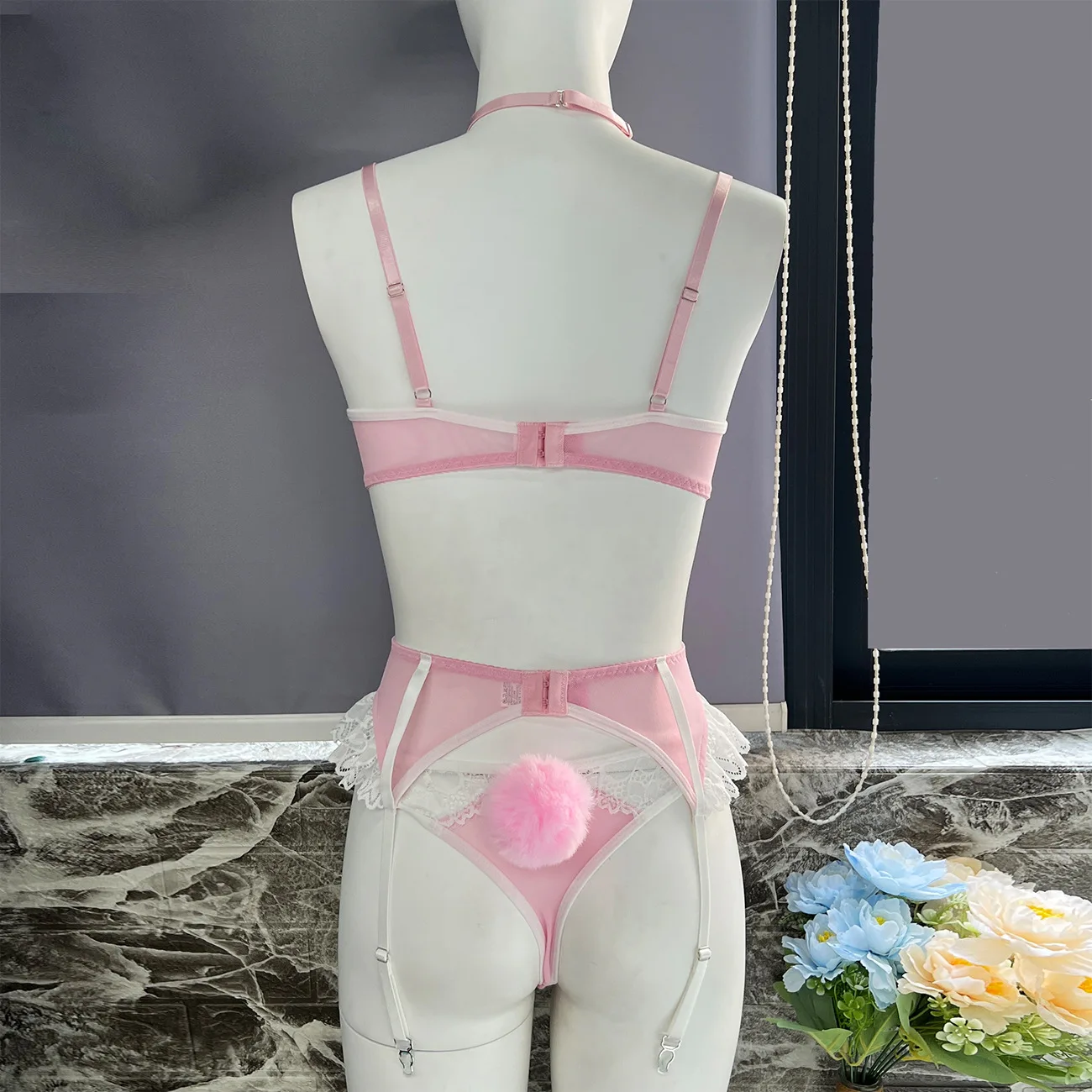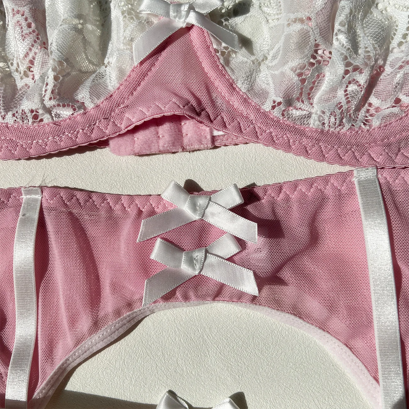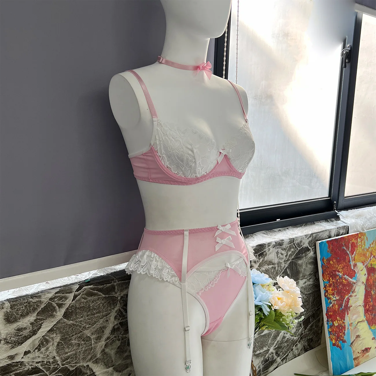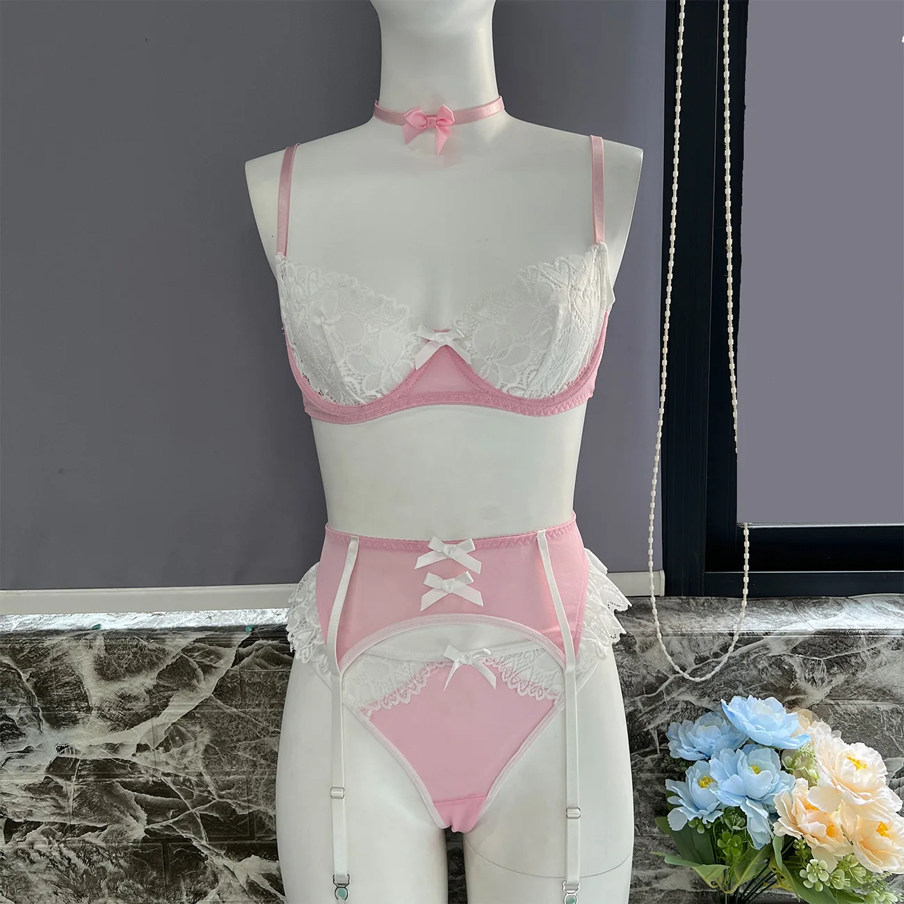 Yimunancy Contrast Color 5-Piece Maid Lingerie Set Women Bow Choker Bra + Ball Breif Underwear Set Stockings Garter Kit