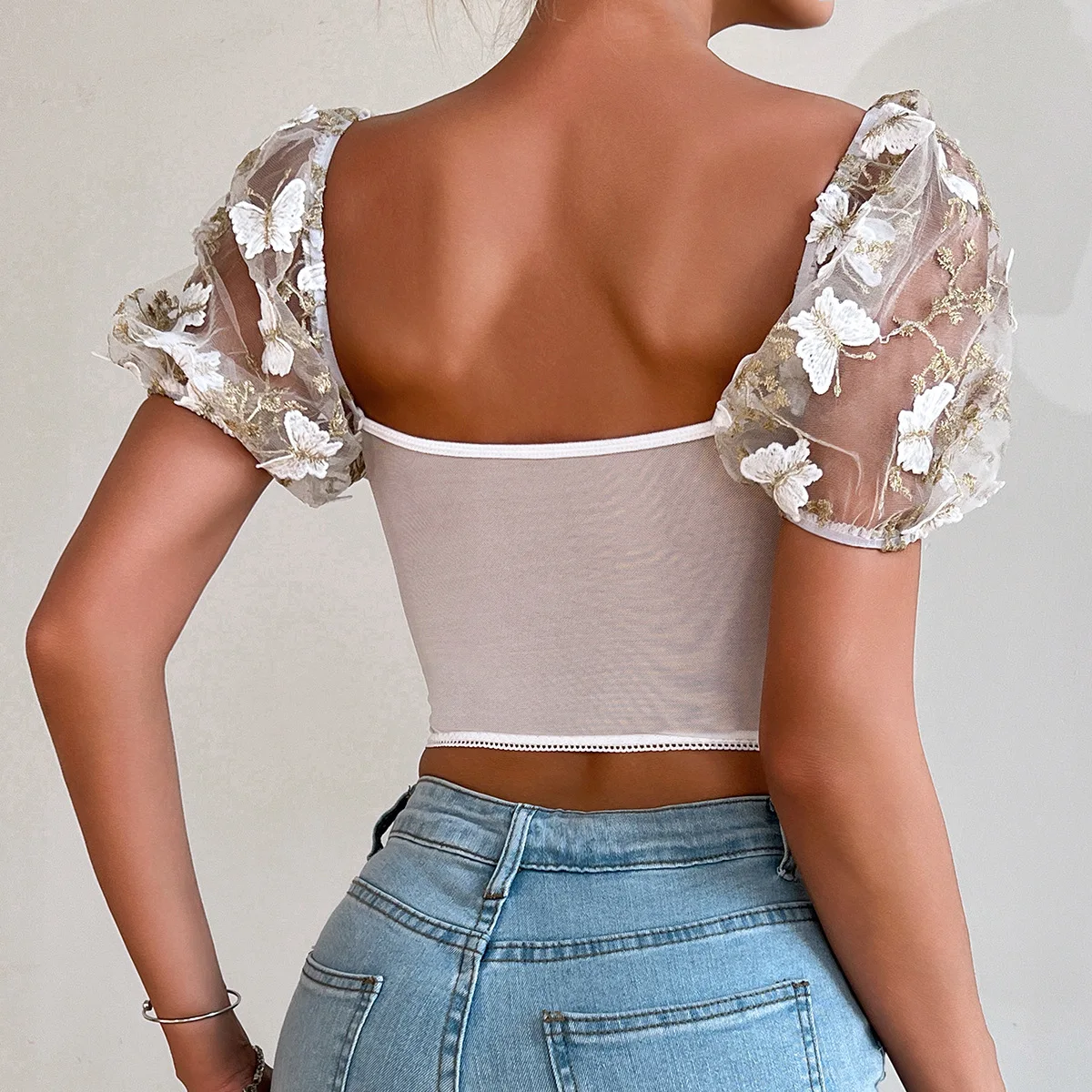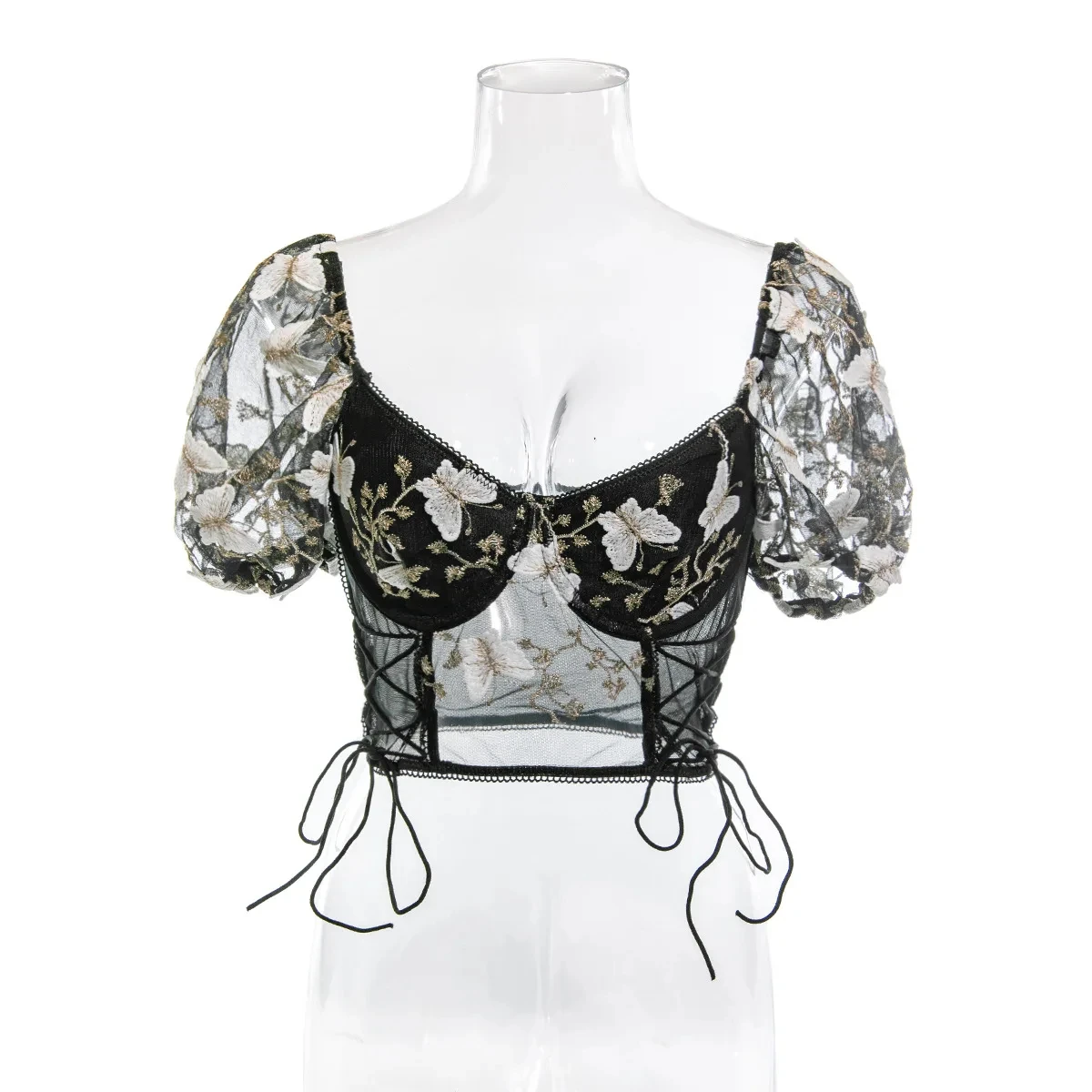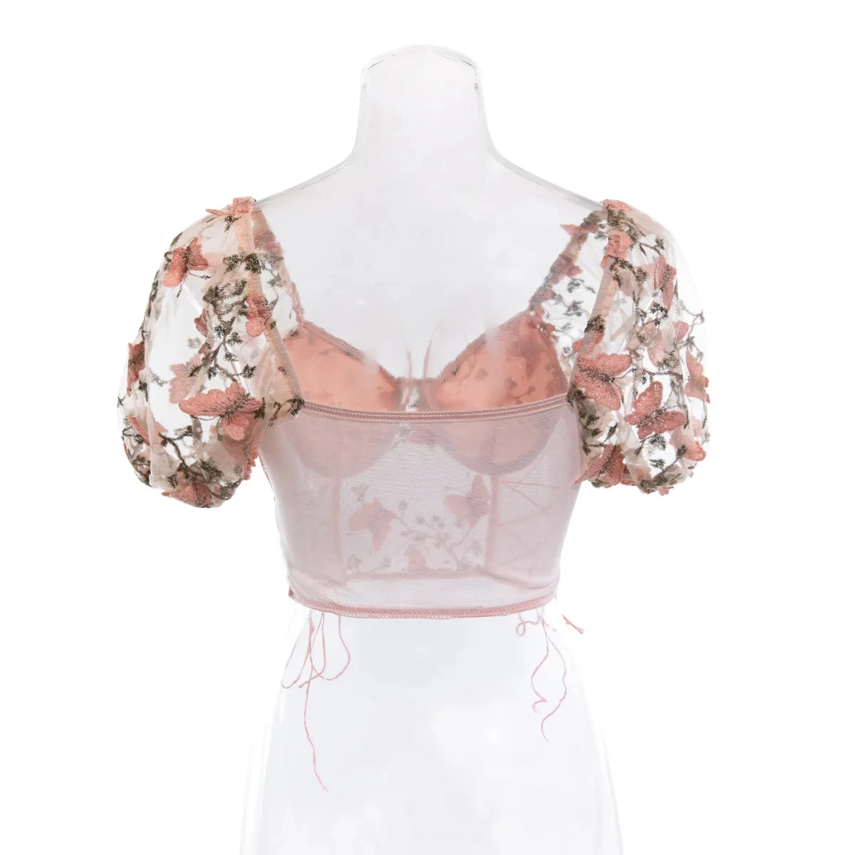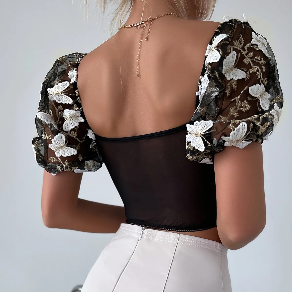 Yimunancy Floral Embroidery Crop Tops Women Puff Sleeve Ruched Backless Boho Tops