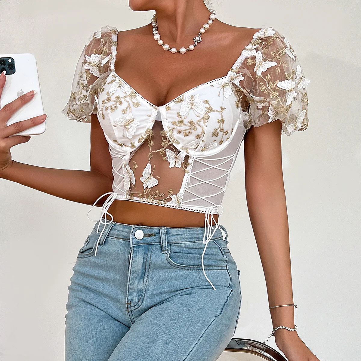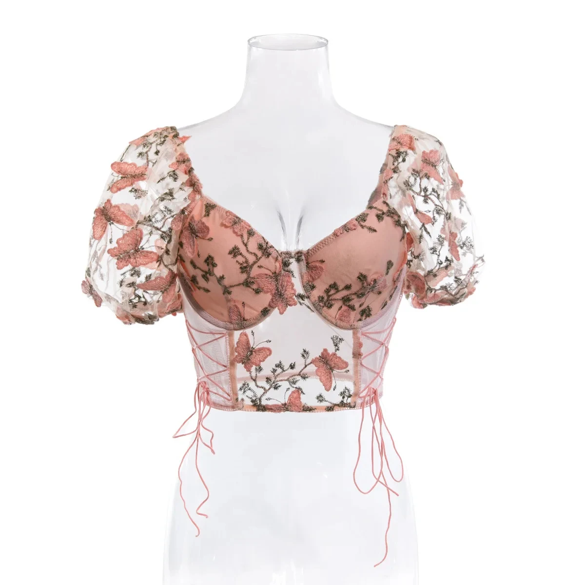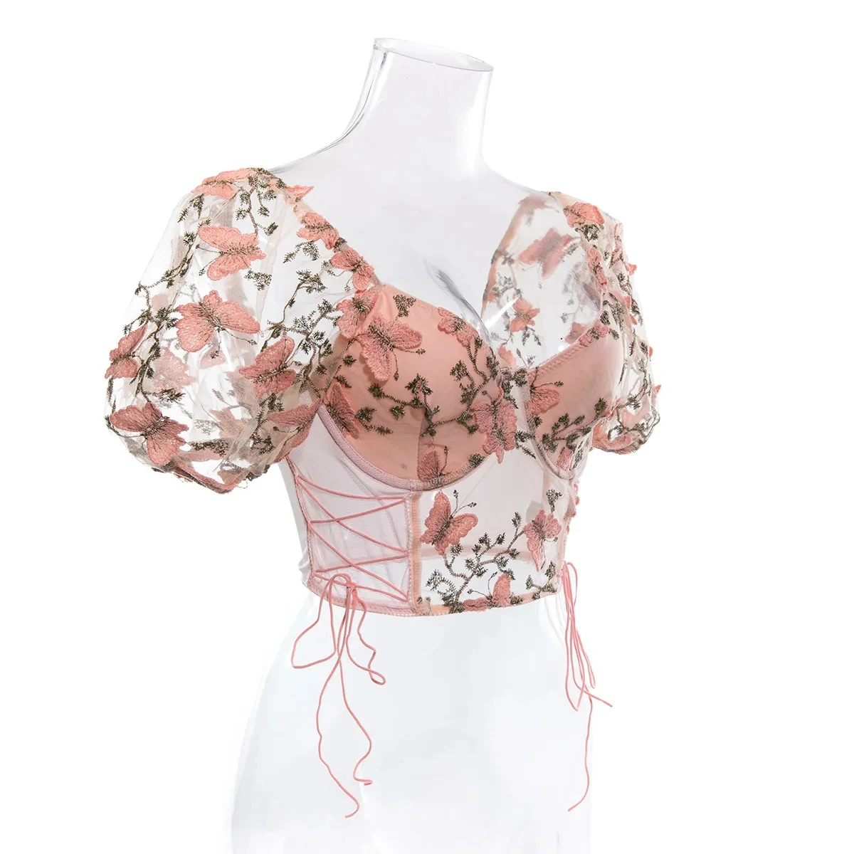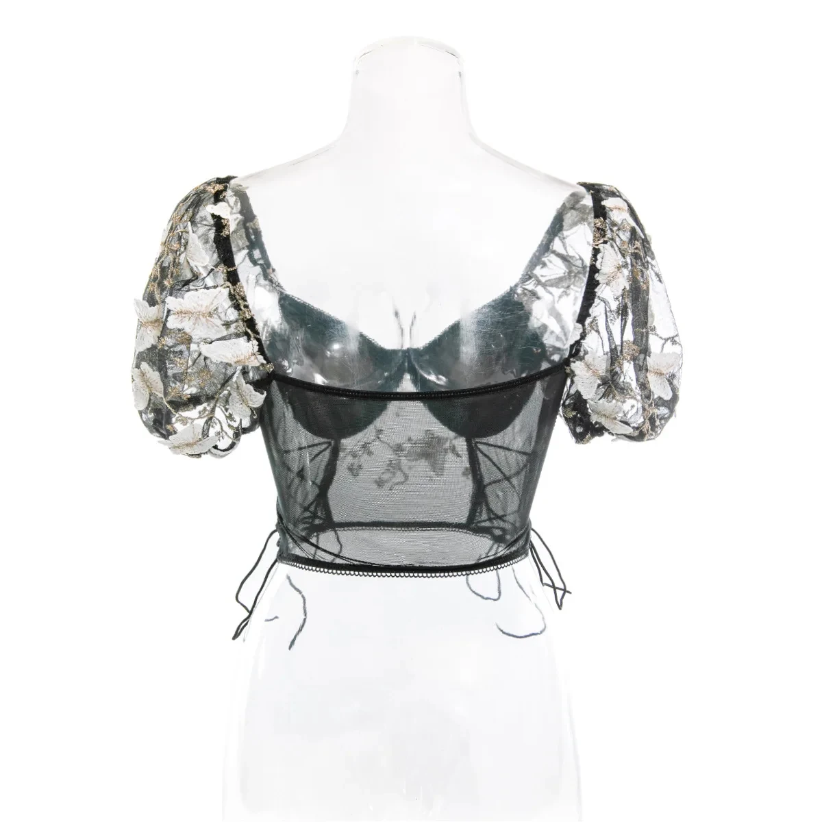 Yimunancy Floral Embroidery Crop Tops Women Puff Sleeve Ruched Backless Boho Tops