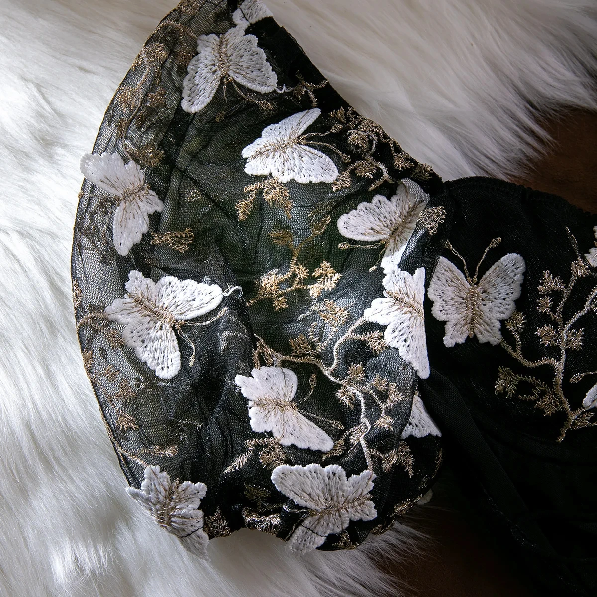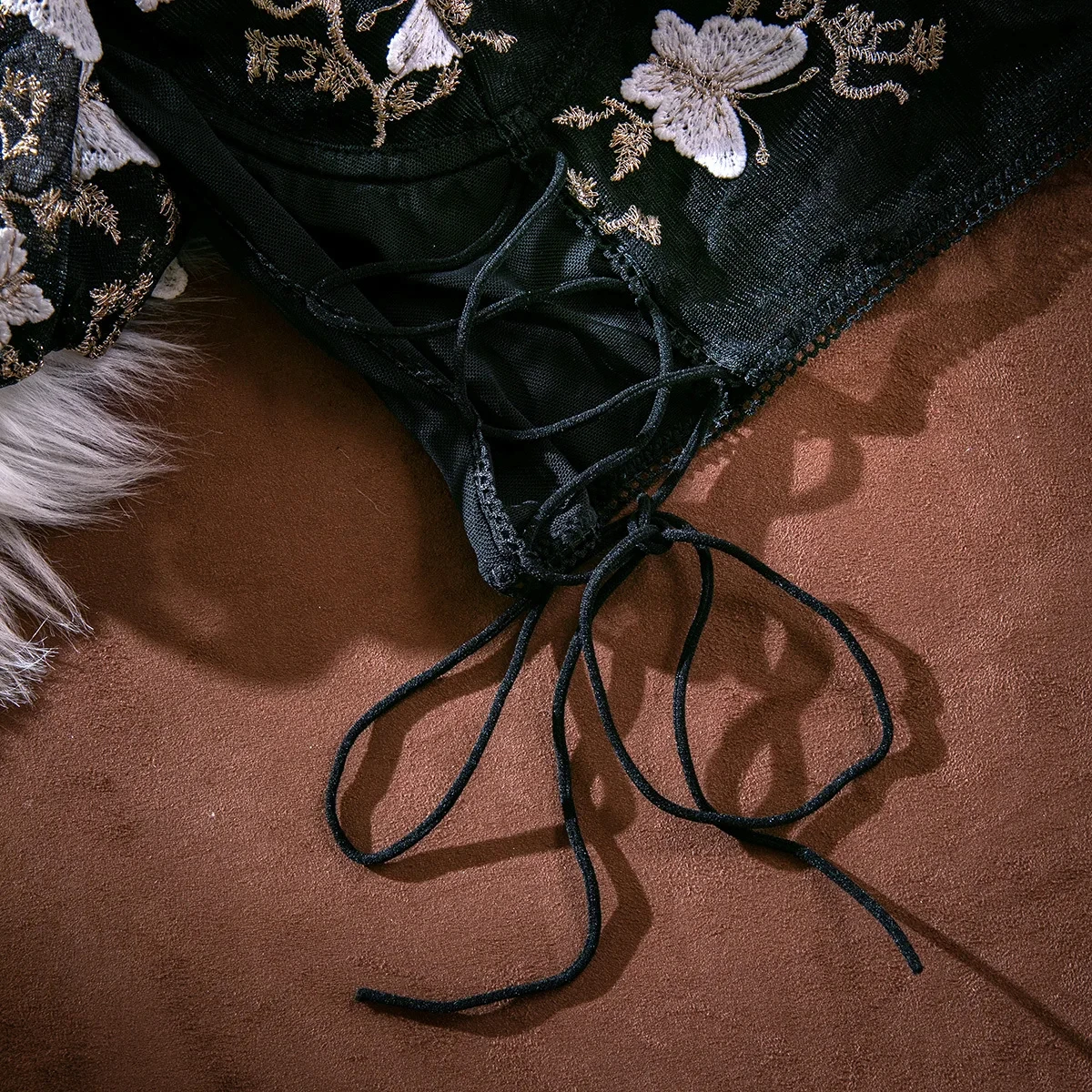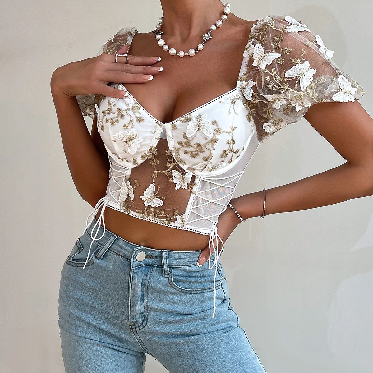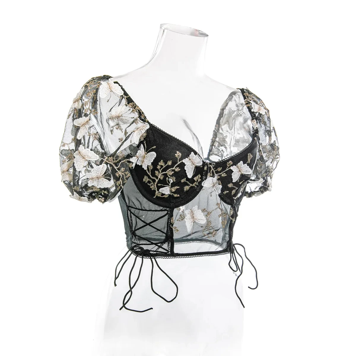 Yimunancy Floral Embroidery Crop Tops Women Puff Sleeve Ruched Backless Boho Tops