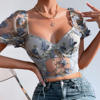 Yimunancy Floral Embroidery Crop Tops Women Puff Sleeve Ruched Backless Boho Tops