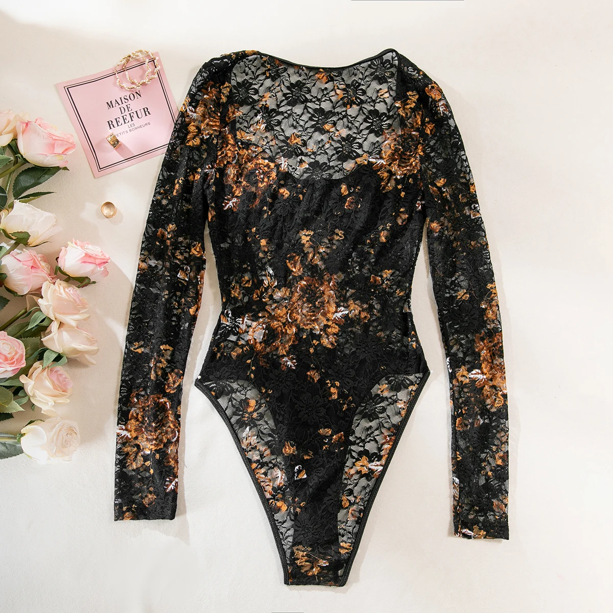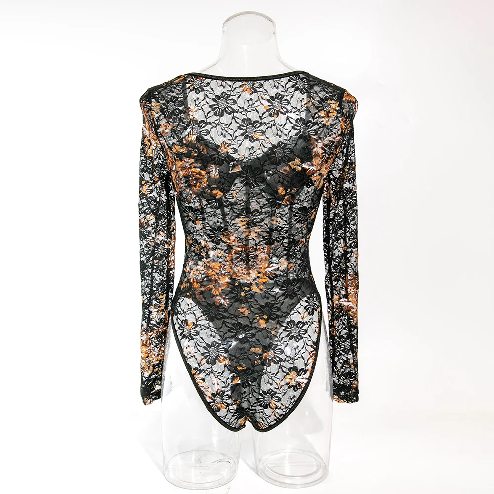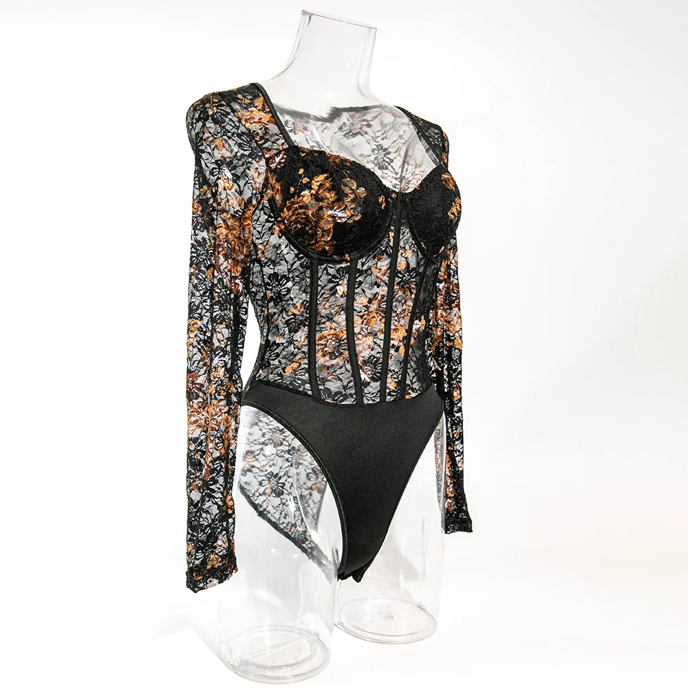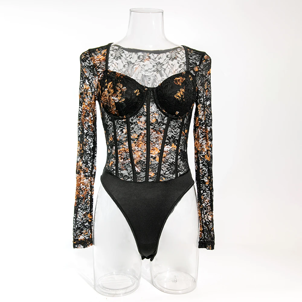 Yimunancy Floral Vintage Long Sleeve Bodysuit Women V Neck Lace Bodysuit Skinny Body Femme Clubwear