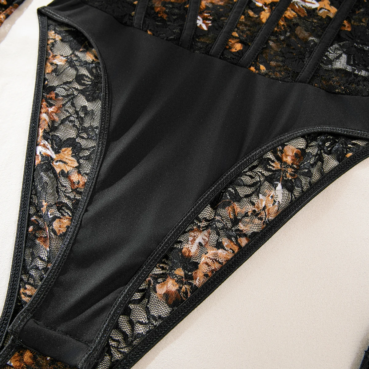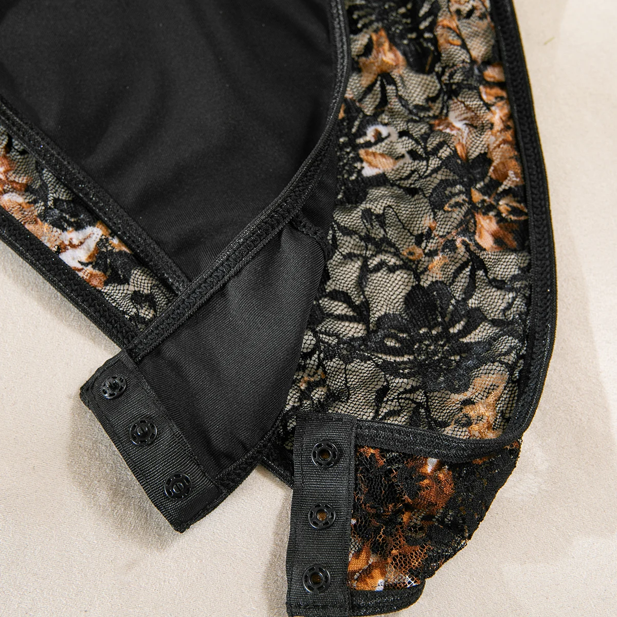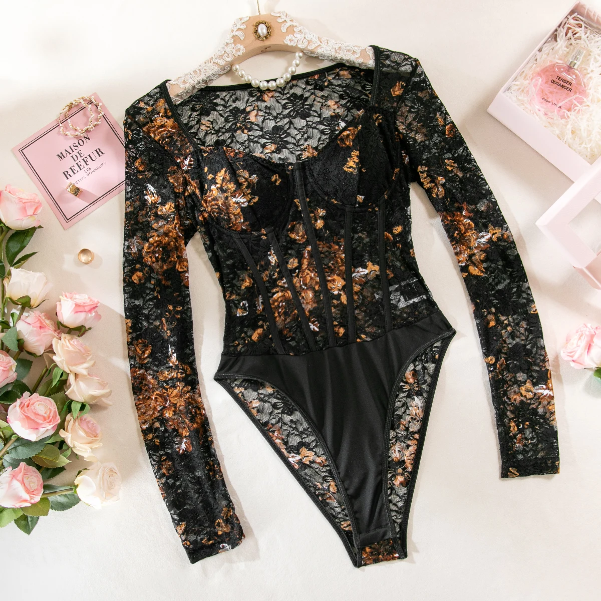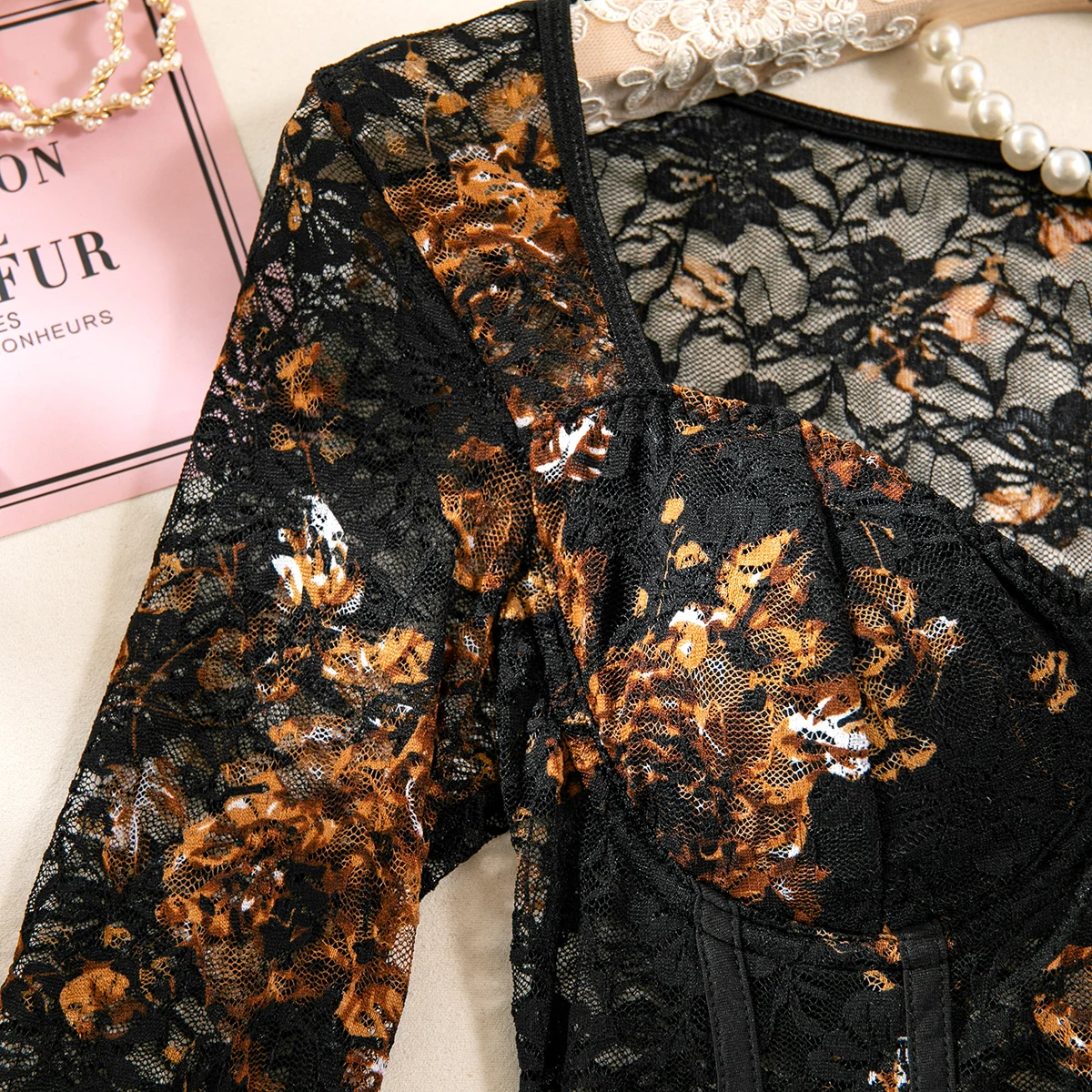 Yimunancy Floral Vintage Long Sleeve Bodysuit Women V Neck Lace Bodysuit Skinny Body Femme Clubwear