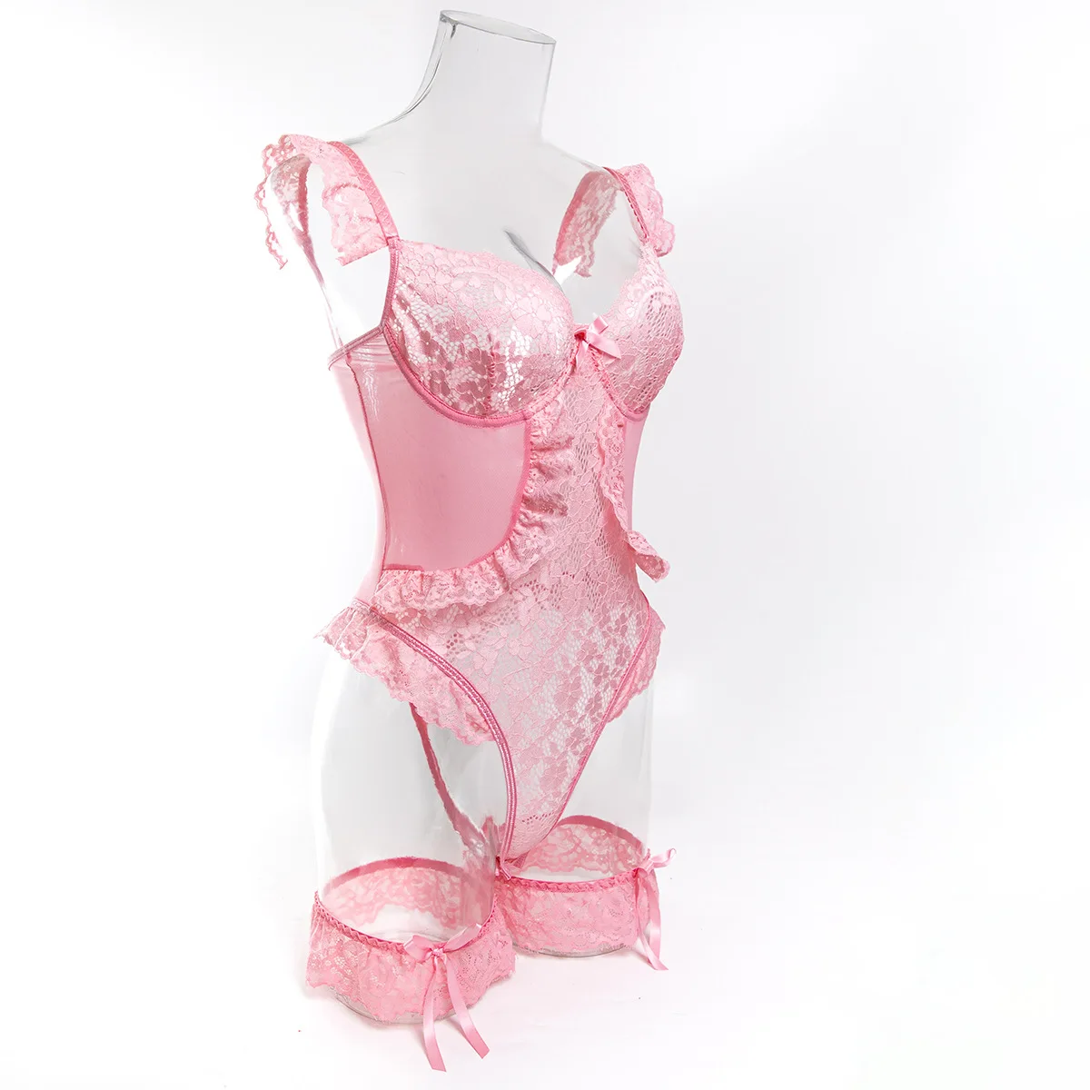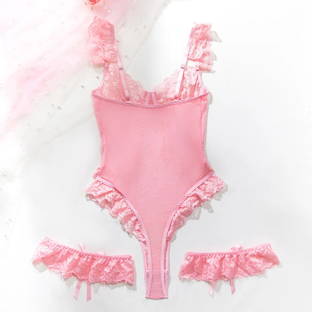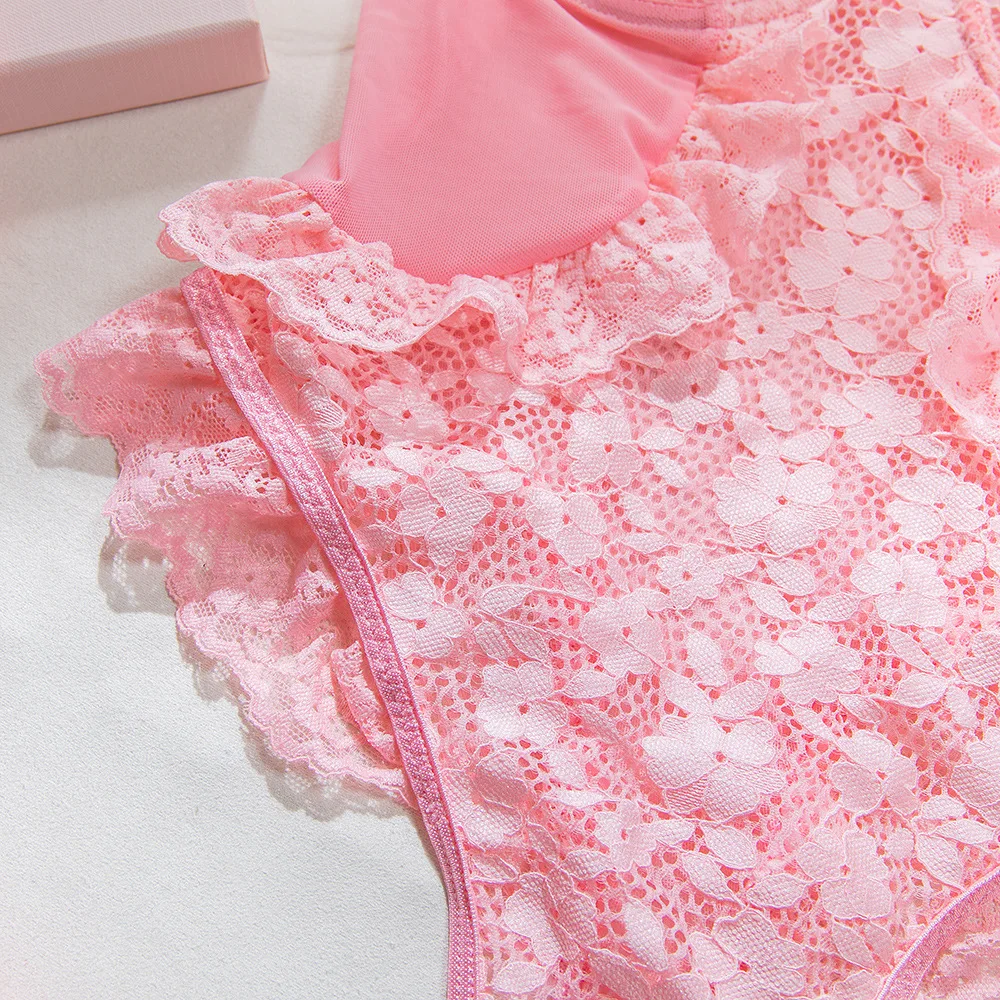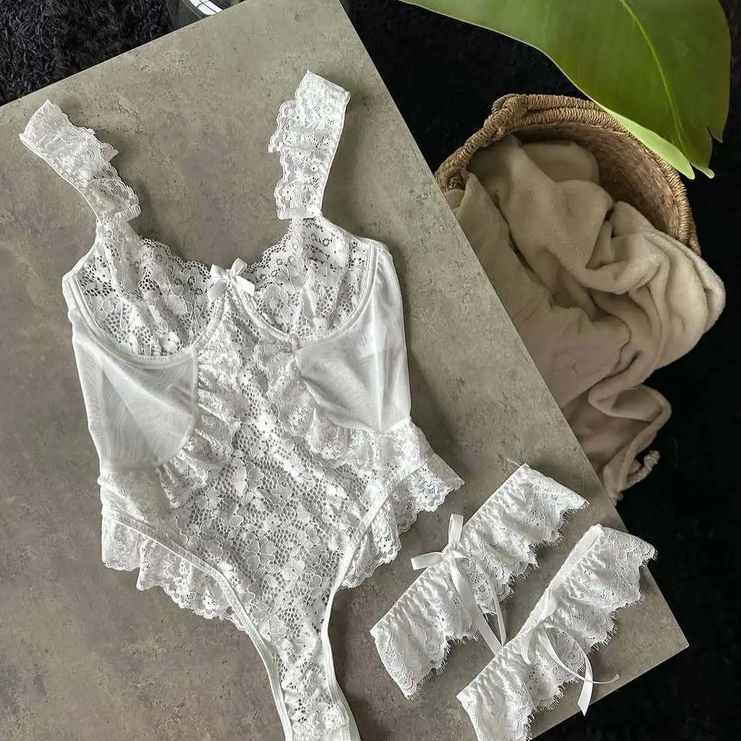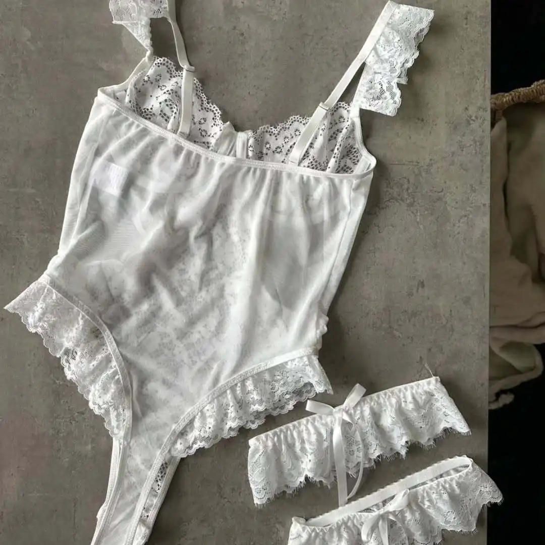 Yimunancy Lace Bodysuit Women 2-Piece Sensual Mesh Bodysuit Exotic Ruffle Backless Body Femme Sexy Intimates