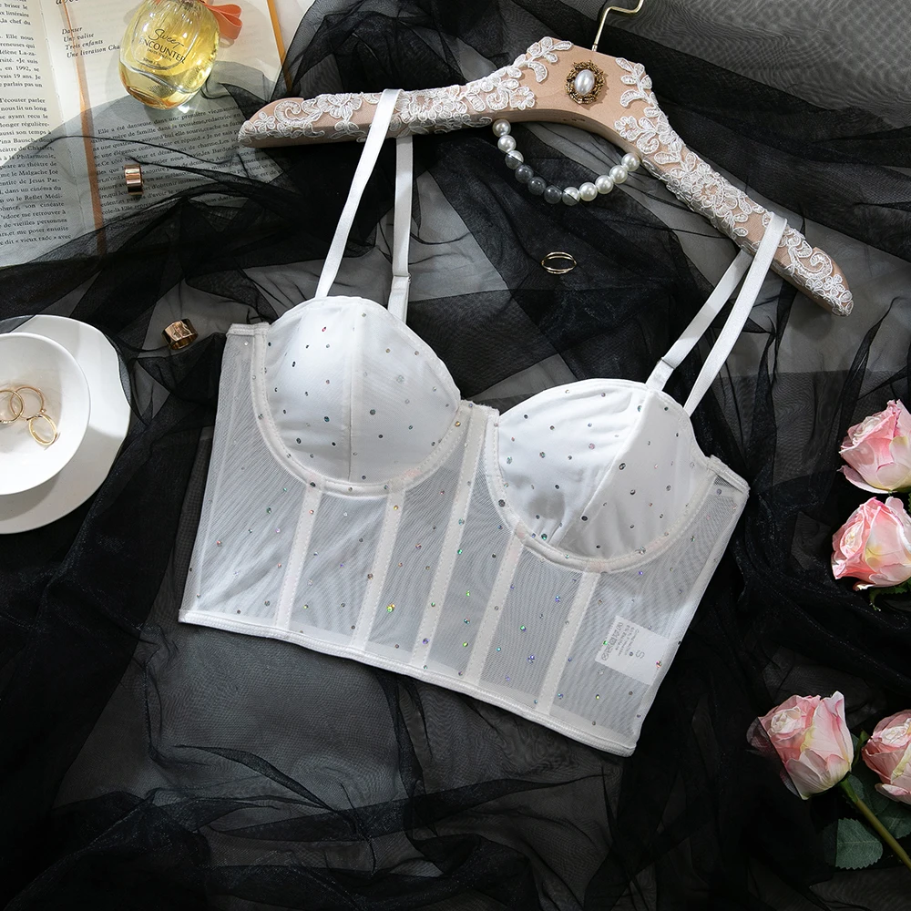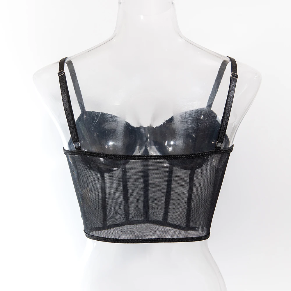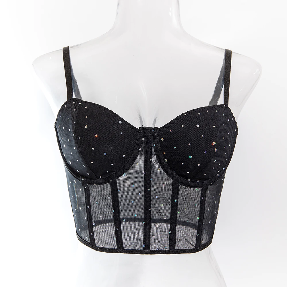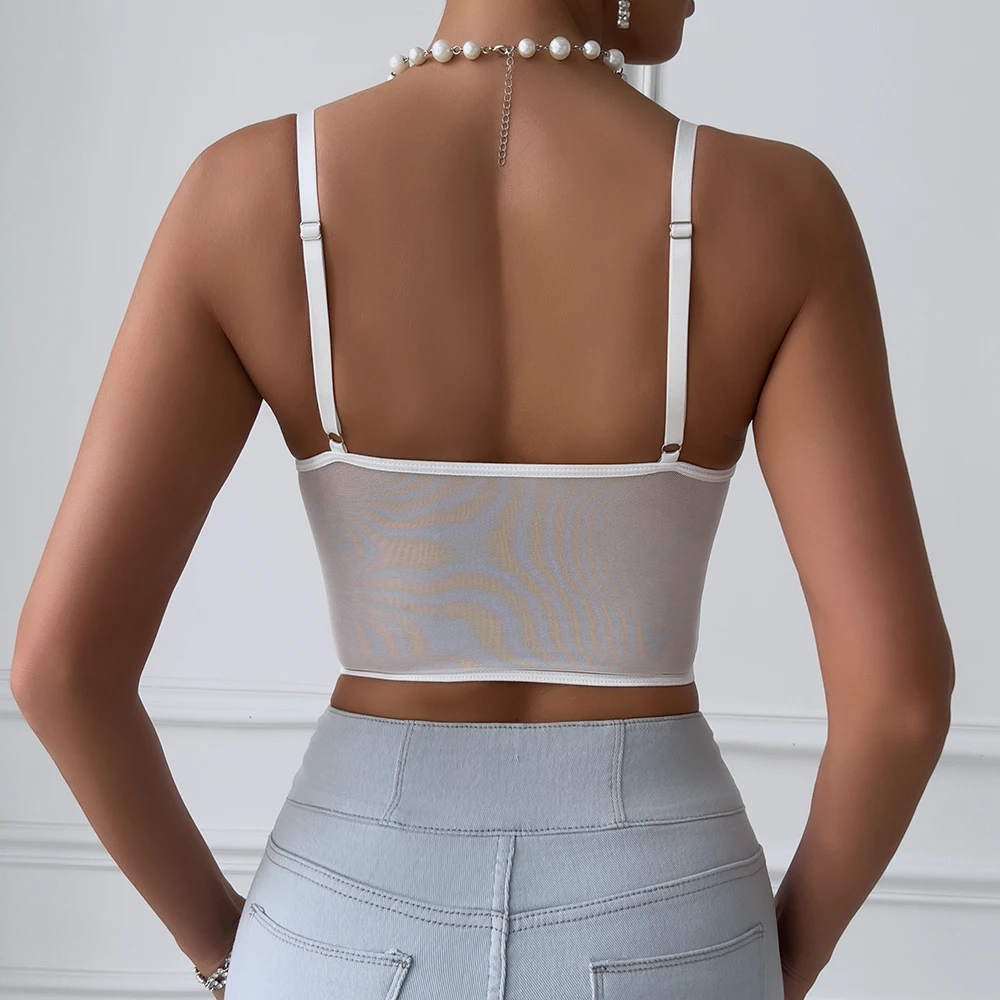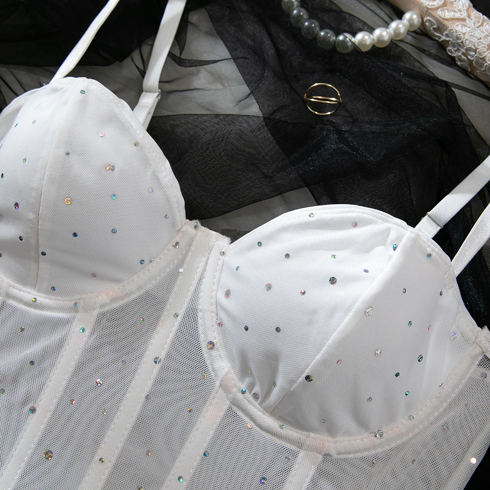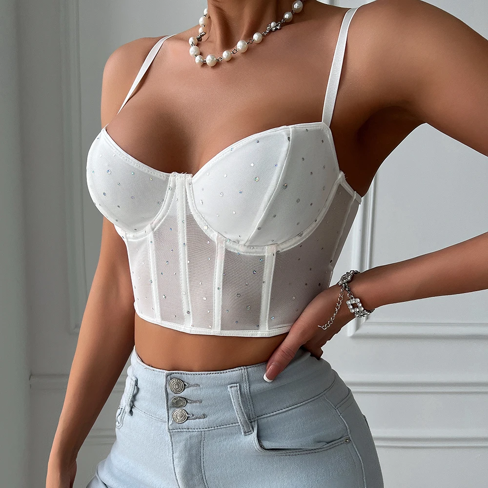 Yimunancy Rhinestone Camisole Women Cropped Top Backless Summer Sexy Mesh Top Blusas